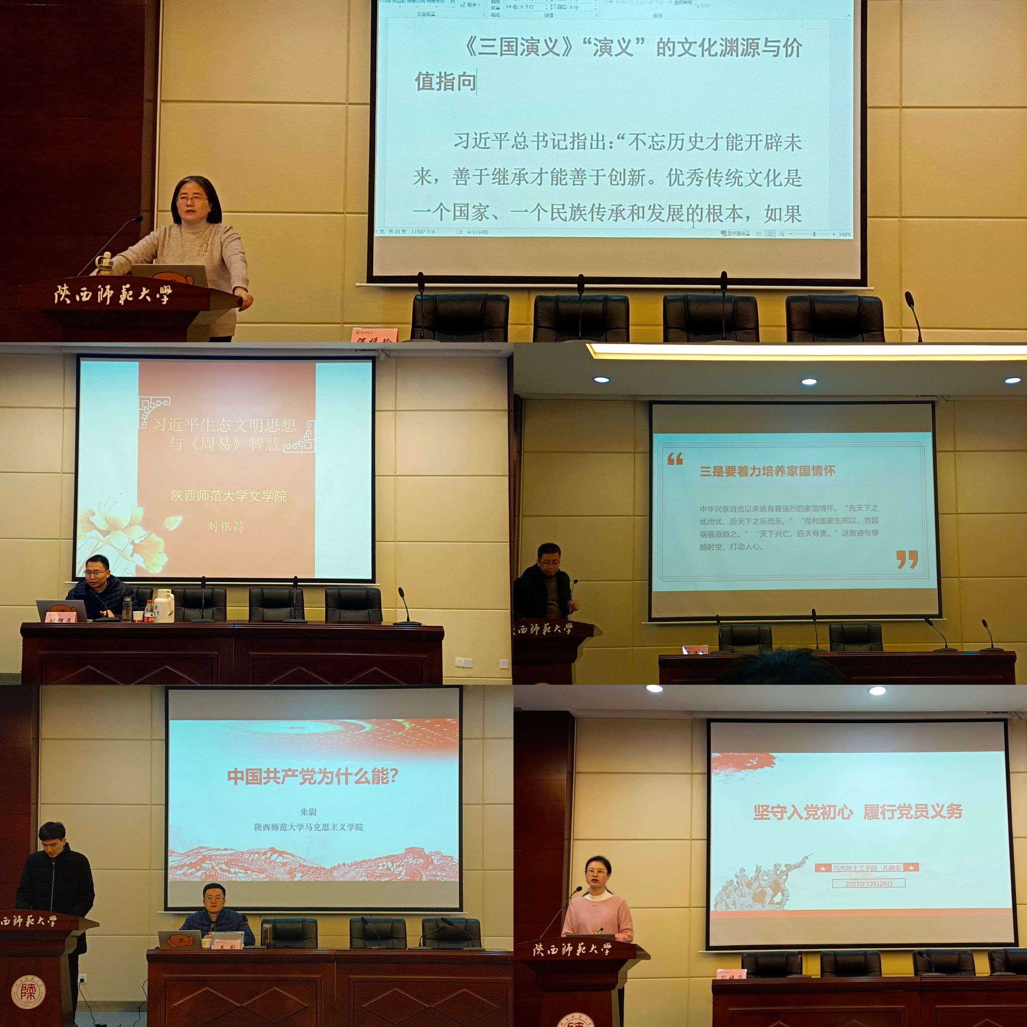 培训中,范海龙以《新时代新征程中国共产党人担当精神培育》为题,从担当的含义、来源和思想基础等方面强调了担当精神的重要性。何悦玲以《中国古代经典小说戏曲传承的优秀“民族精神”及价值启示》为题,深入解读《三国演义》经典片段,阐释了中华优秀传统文化尚贤尚义的民族精神。刘银昌以《习近平生态文明思想与〈周易〉智慧》为题,通过对习近平生态文明思想和《周易》生态理念的阐述,强调了保护生态环境之于中华民族乃至全人类文明永续发展的重要意义。朱尉以《中国共产党为什么能》为题,从“中国共产党为什么能建立新中国”“中国共产党为什么能取得现代化建设的巨大成就”几个问题出发,解答了“中国共产党为什么能”这一重要问题。孔晓菲以《坚守入党初心,践行党员义务——基于对〈中国共产党章程〉的学习》为题,介绍了共产党员的入党初心、义务权利及使命担当,号召大家坚守初心,牢记使命,加强党性修养。