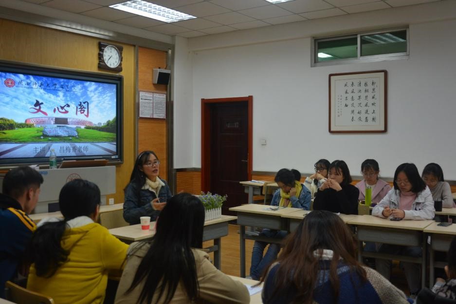 10月25日19:10,本学期第3期(总第235期)文心阁交流活动在文渊楼3103教室顺利开展,太阳成集团tyc副教授昌梅香老师应邀参加本次活动。昌梅香老师主要讲授《现代汉语》、《语言学概论》、《汉语词汇学》等课程。在此次文心阁活动中,昌老师从自己的研究领域出发,介绍了相关专业的学科背景,分享了学习和研究经验,并解答了同学们的问题。