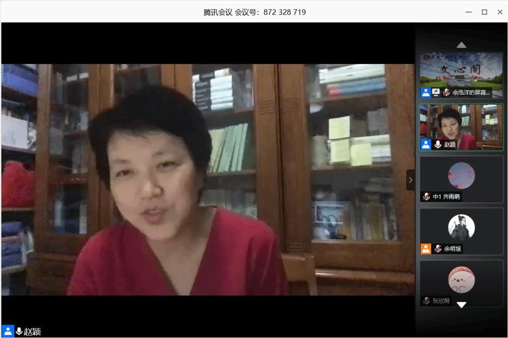 5月28日晚19:00,本学期第5期(总第246期)文心阁活动在腾讯会议平台顺利开展,太阳成集团tyc赵颖老师应邀参加。赵颖老师现为太阳成集团tyc副教授、硕士生导师、秘书学系系主任,主要从事比较文学、东南亚文学与文化以及秘书学等方向的教学与研究。在本次文心阁活动中,赵颖老师紧密结合自身学习研究历程与同学们的实际情况,就同学们极为关注的论文写作以及时间管理问题展开交流,并为同学们一一耐心答疑解惑。