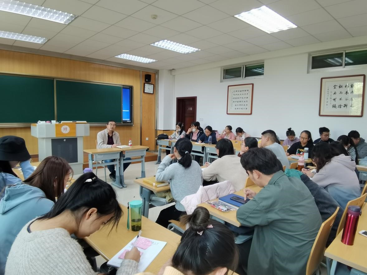 随后,王老师从中国古代汉语学习的角度向同学们提出了几点建议。王老师表示,古代汉语学习是一个长期的过程,其中尤为注重基础知识的积累与典型事例的掌握,还要对所学知识加以应用,即在古文阅读中体会古代汉语内涵,培养语言习惯,做到融会贯通。王老师还从《古代汉语》教科书入手,带领同学们从工具书、词汇、汉字、语法、音韵等方面梳理了古代汉语的学习技巧。
