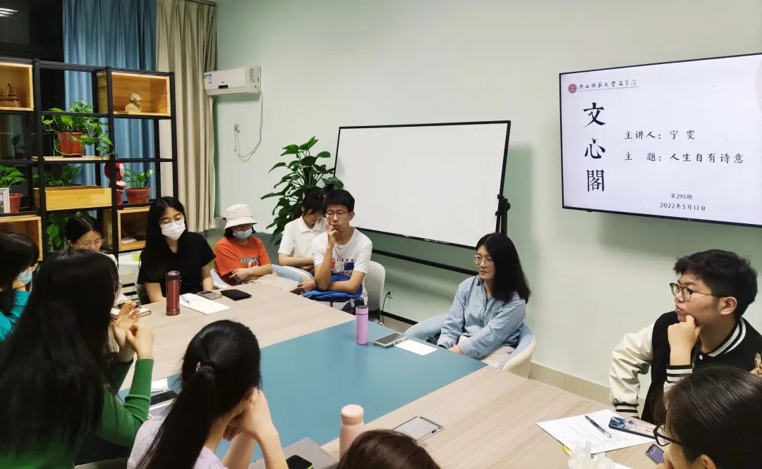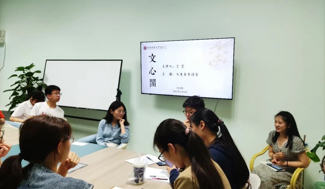 5月11日晚,本学期第5期(总第295期)文心阁师生面对面交流活动顺利举行,太阳成集团tyc中国古代文学教研室的宁雯老师应邀参加。本次活动中,宁老师围绕“人生自有诗意”这一主题,与同学们亲切交流。