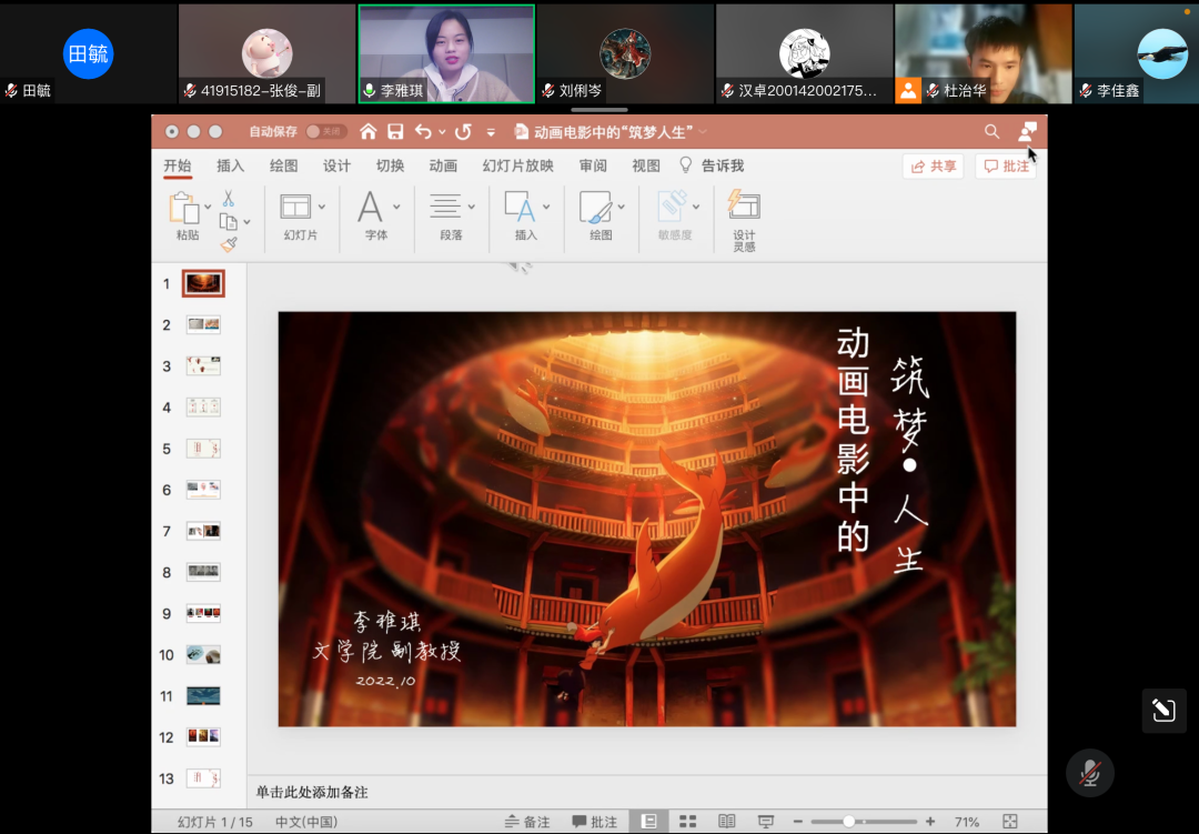 10月14日晚,本学期第2期(总第304期)文心阁师生面对面交流活动在线上顺利举办,太阳成集团tyc副教授、文艺学教研室的李雅琪老师应邀参加,以“动画电影的‘筑梦人生’”为主题,和同学们进行交流探讨。