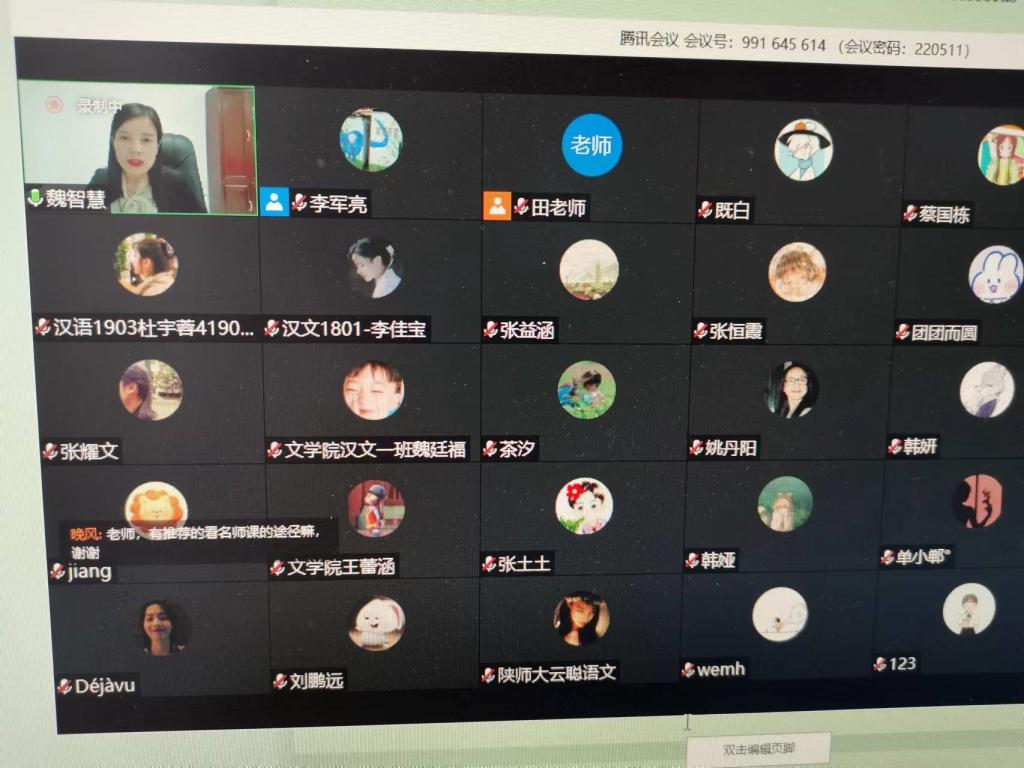 (通讯员:赵妤婕)2022年5月12日晚,公司特别邀请了商洛市第四届政协委员、陕西省学科带头人、陕西省优秀教师、陕西省教学能手魏智慧老师为公司师范生作专题讲座,题目为“核心素养视域下的个性化文本解读”,讲座以腾讯线上会议的形式进行,由太阳成集团tyc副教授李军亮老师主持、点评。