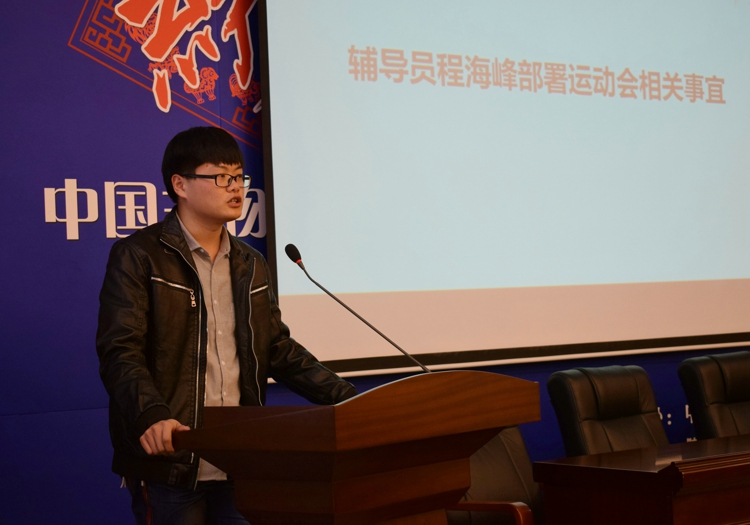 辅导员程海峰就公司组队参加校动会进行具体安排,鼓励同学们以昂扬的激情,饱满的热情,全力投入校运会的筹备中,争取高质量、高效率地完成任务,团结一心,坚持每日一练,做到有纪律、有斗志、听指挥、打胜仗,撸起袖子加油干,斗志昂扬创辉煌。