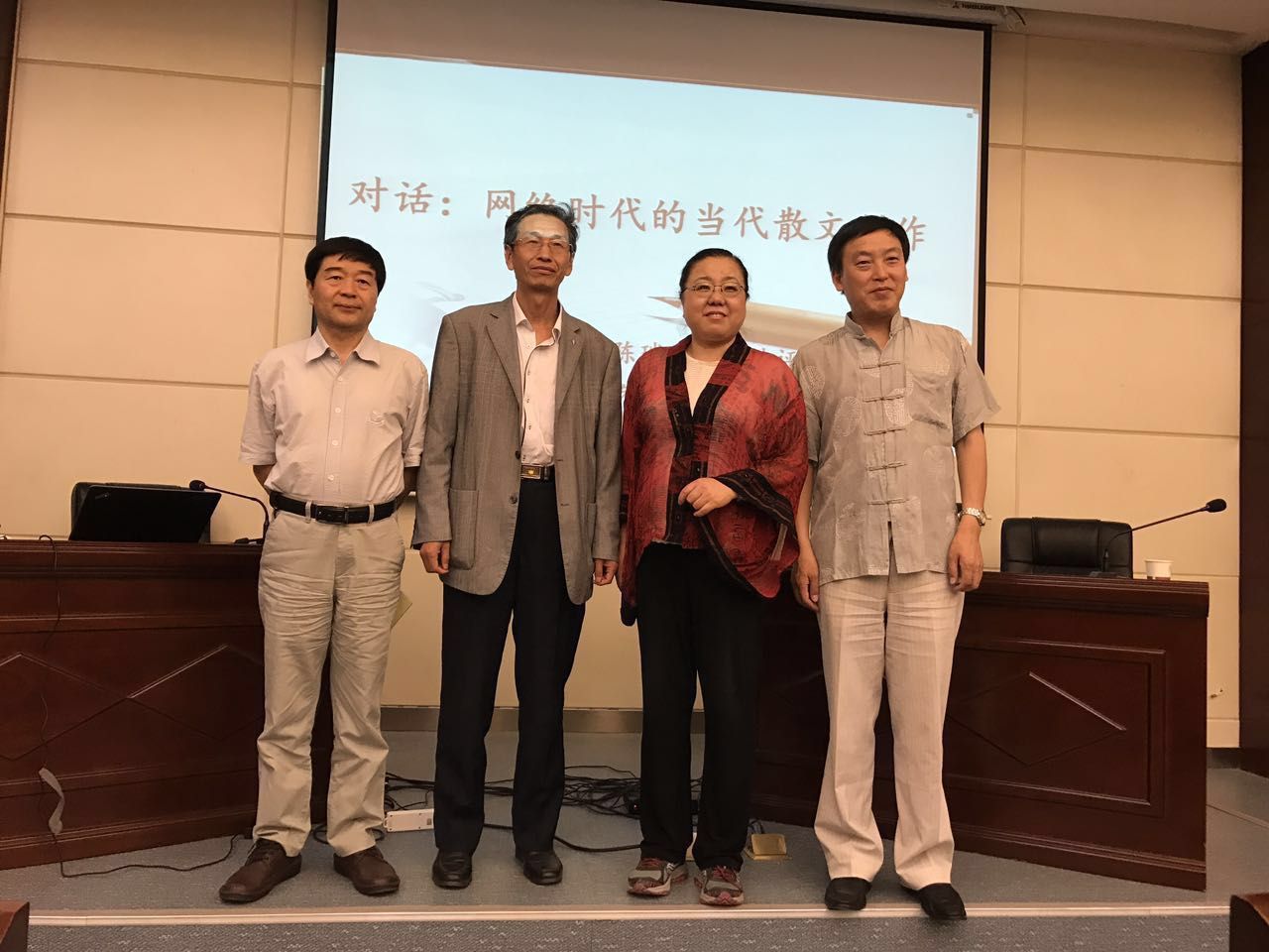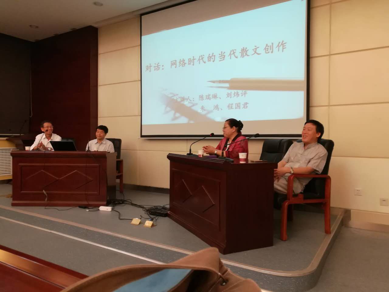 本次讲座以对话形式展开,四位教授从不同方面探讨当下散文创作的新形态。朱鸿教授认为,人性始终是散文创作的关键。同时陈瑞琳教授提出散文创作既要情感真诚,也应坚持朱鸿教授提出的情感节制原则。刘炜评教授与朱鸿教授就“大散文”创作展开了热烈探讨。四位教授的谈话有共鸣,也有思维的碰撞,严肃又不乏幽默风趣。