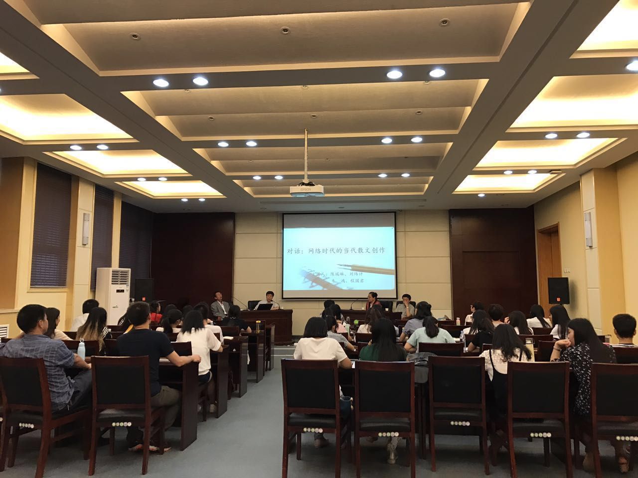 晚7点,报告正式开始。程国君教授从现代散文的发展历程展开本次对话,程国君教授提出网络时代与全球化时代当代散文发展的特殊之处。接着朱鸿教授对比西方散文与中国散文从古至今发展的不同形态,对当下散文的创作要求进行了具体阐释。陈瑞琳教授提到信息爆炸时代阅读选择的重要性以及散文创作视野的开拓性。紧接着陈炜评教授提到散文在我们阅读中的普遍性与永恒性,以及网络时代散文创作与传播呈现的新特点。至此,围绕讲座主题,四位教授展开了更加深入,更加热烈的交流讨论。