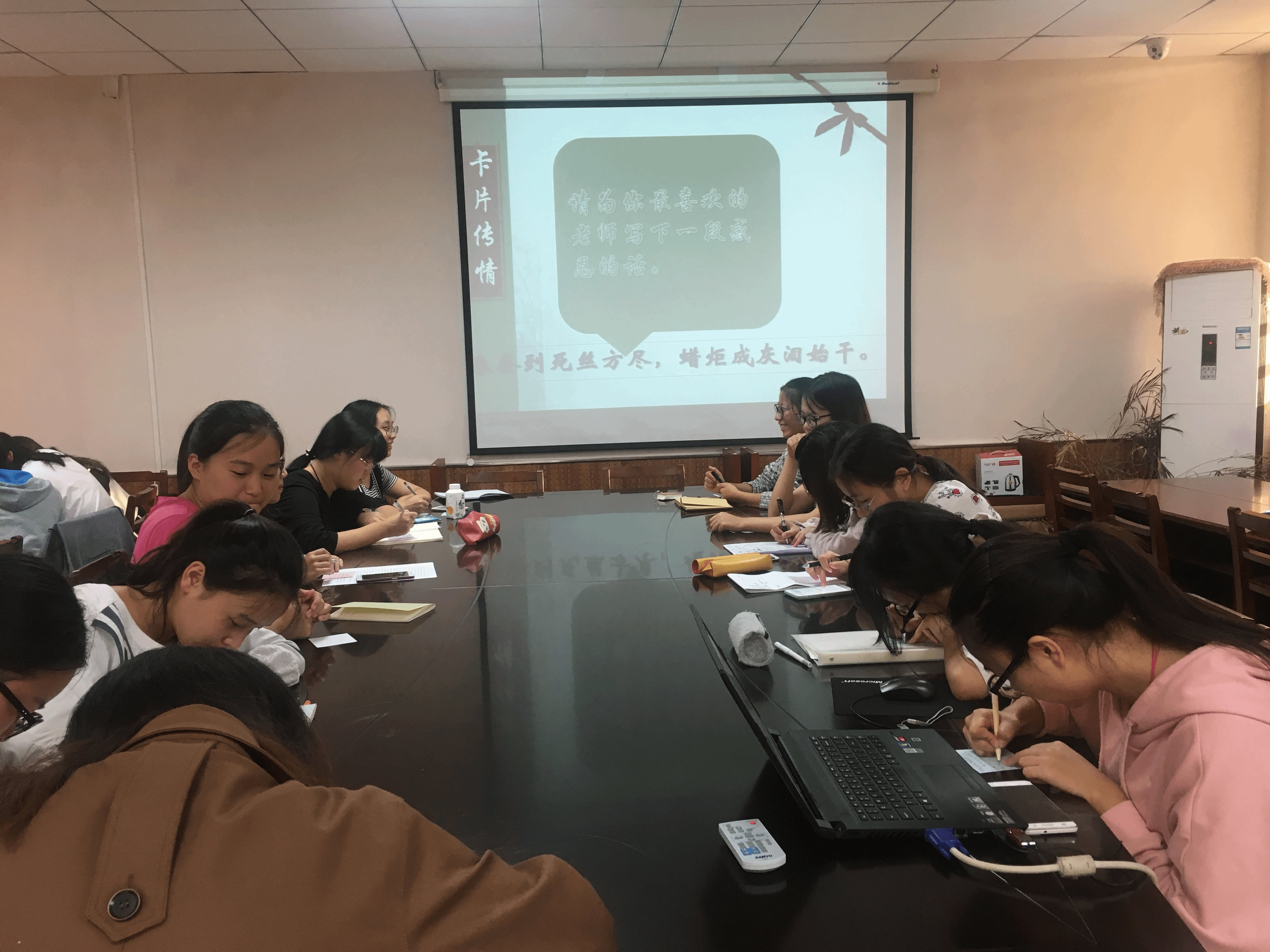 “千里送鹅毛,礼轻情意重。”感恩不在贵重而在情谊,同学们的真心的祝福、诚挚的问候,或是学业的进步,就是给老师最好的礼物。在之后的学习和生活中,同学们将用实际行动来关心、爱护、尊重老师,用傲人的成绩回报老师的每一滴汗水!