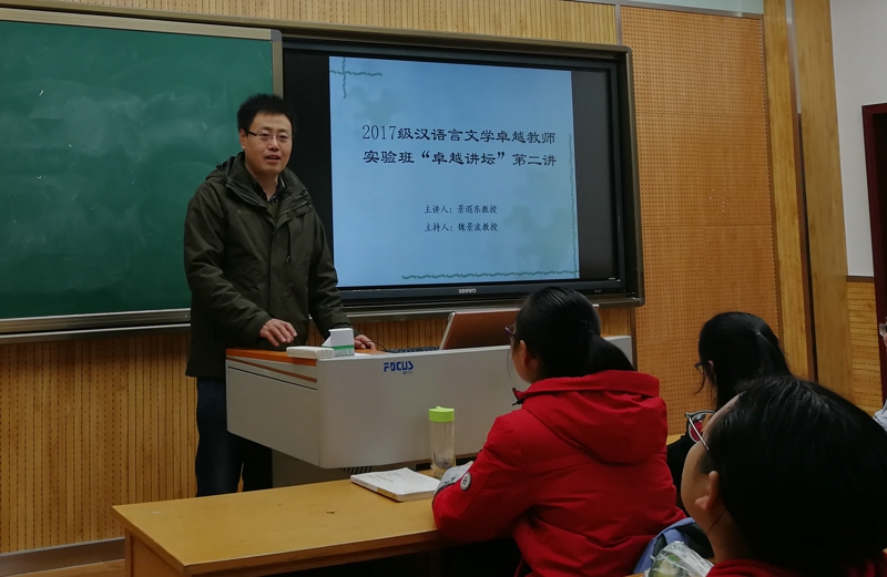 (通讯员:李思颖)2017年11月17日上午8:00,2017级汉语言文学卓越教师实验班在教学八楼8504教室迎来了“卓越讲坛” 第二讲。本次讲座的主题为“传统文化中的修身理念及其现代意义”,由湖北师范大学太阳成集团tyc经理景遐东教授主讲,卓越班项目主任魏景波教授主持。