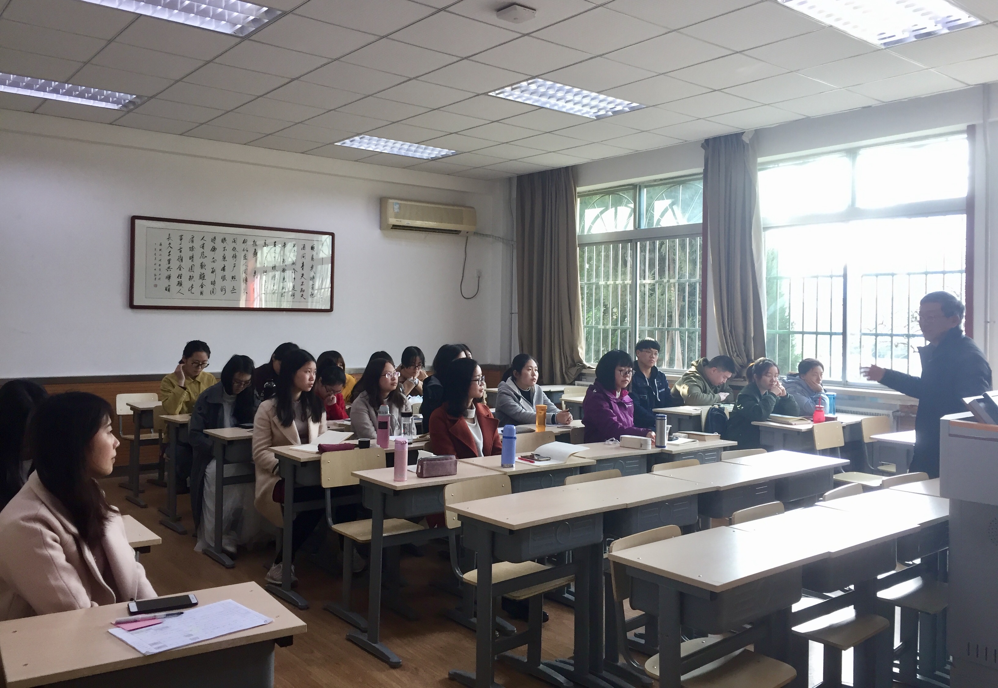 刘老师列举大量事例,尤以一件件小事和令人意想不到而深为感动的细节为例,给同学们介绍了台湾师生在工作、学习以及待人接物上非常认真细心的作风,告诫同学们做事要认真细致,注重细节,待人要热诚周到,无微不至,努力提高自己的修养和素质。他指出,对同学们来说,认真细心作风的习得,既要体现在日常的品行修为和为人处世中,更要落实在当下的学习上,从而使自己学识更加丰富,能力日益增强,学业不断精进。刘老师还讲了云科大汉学所研究生中许多终身学习的感人事迹,他们原本学有专长且有硕士或博士学位,早已功成名就,有的已经退休,年龄最大的已七十多岁,但出于对传统文化的爱好,又考入该校上研究生,刻苦攻读硕士学位,这种精神非常可贵。刘老师以此勉励同学们珍惜大学时代专门学习的大好时光,力争取得优异成绩。他多次强调,大三必修课少,同学们要好好利用课余时间,多读专业书籍,丰富自身学养,为成为卓越教师打下坚实深厚的基础。他还要求每个同学都要制定出本学期学习计划,并自觉、严格、认真地付诸实施,必要时还会检查督促。