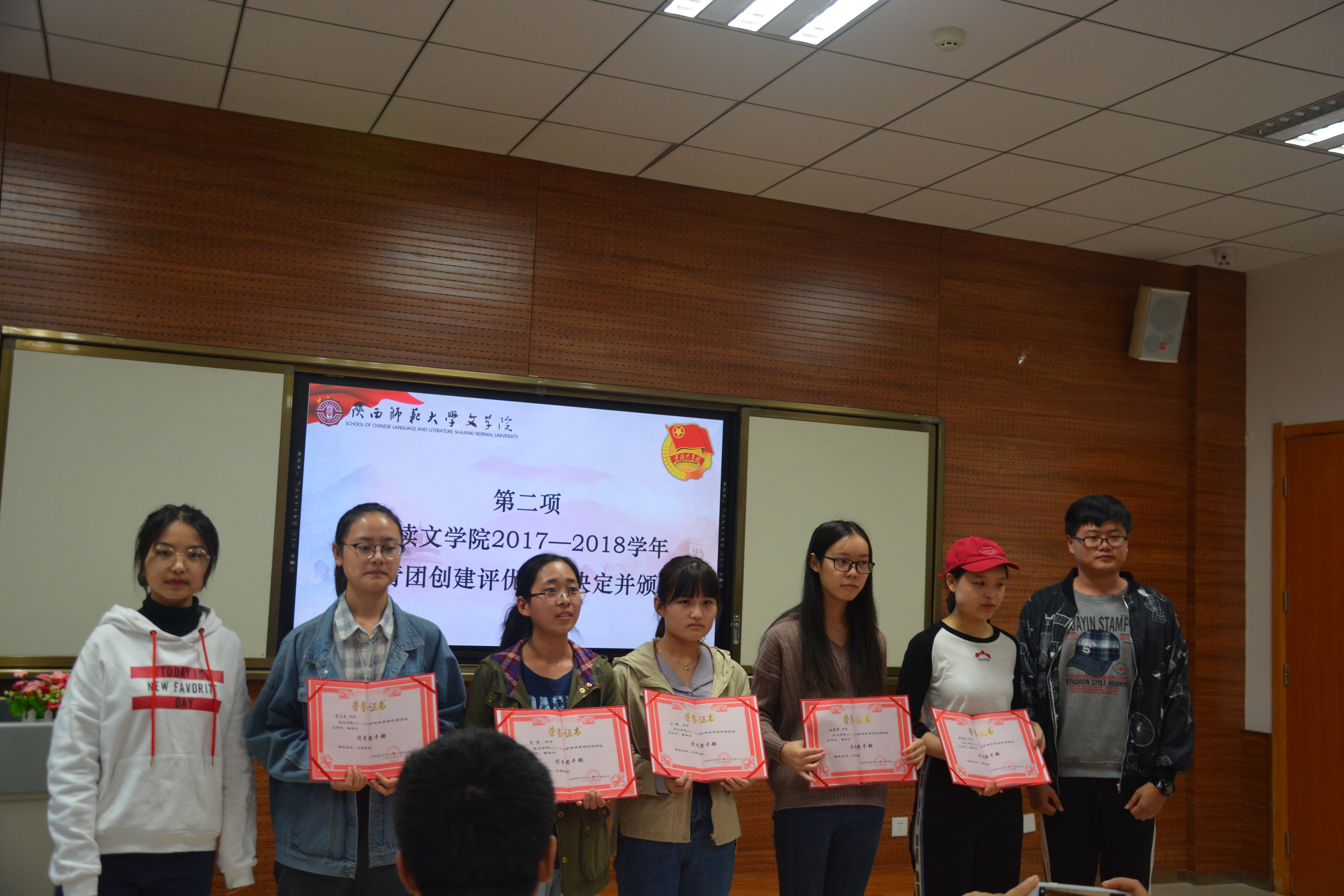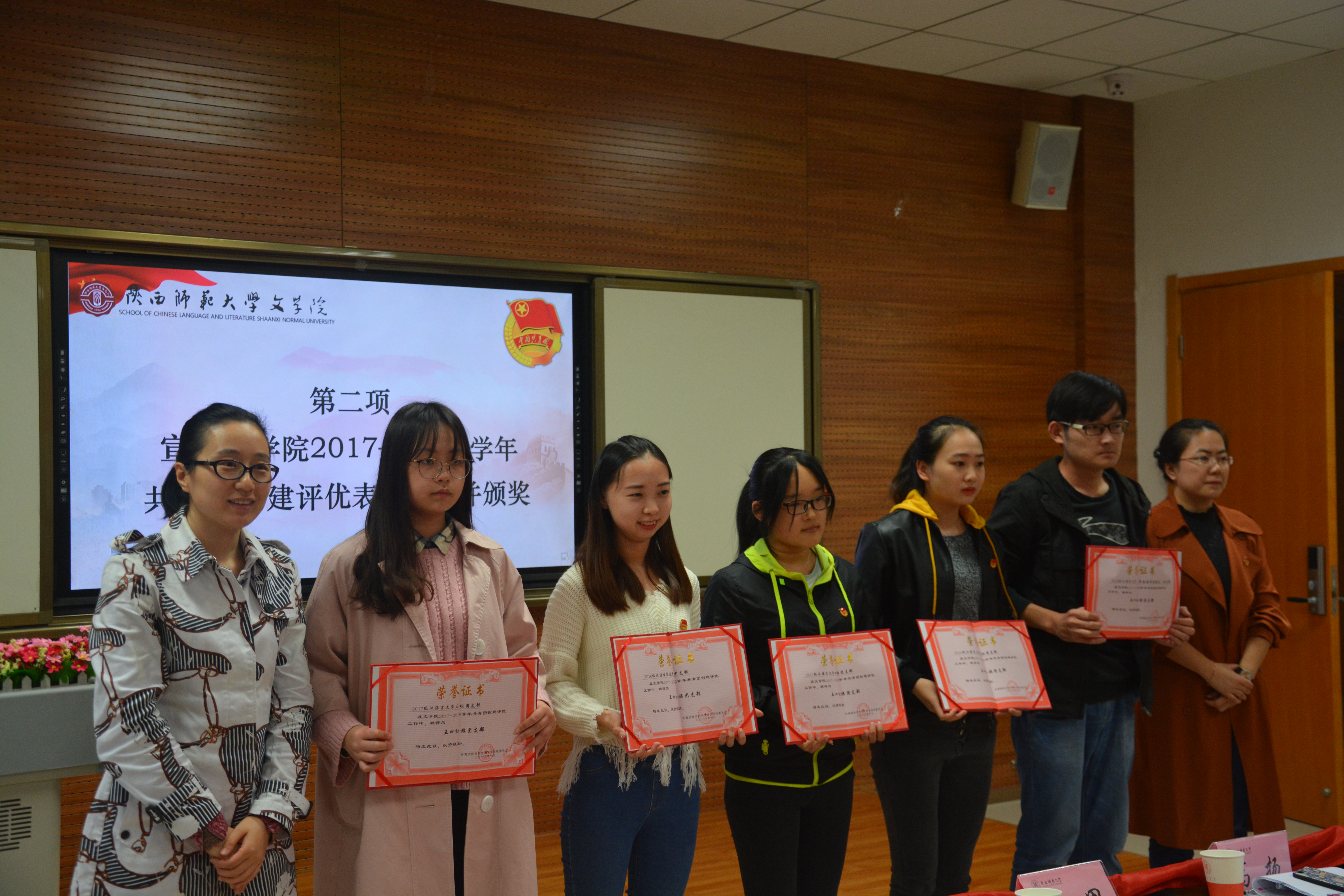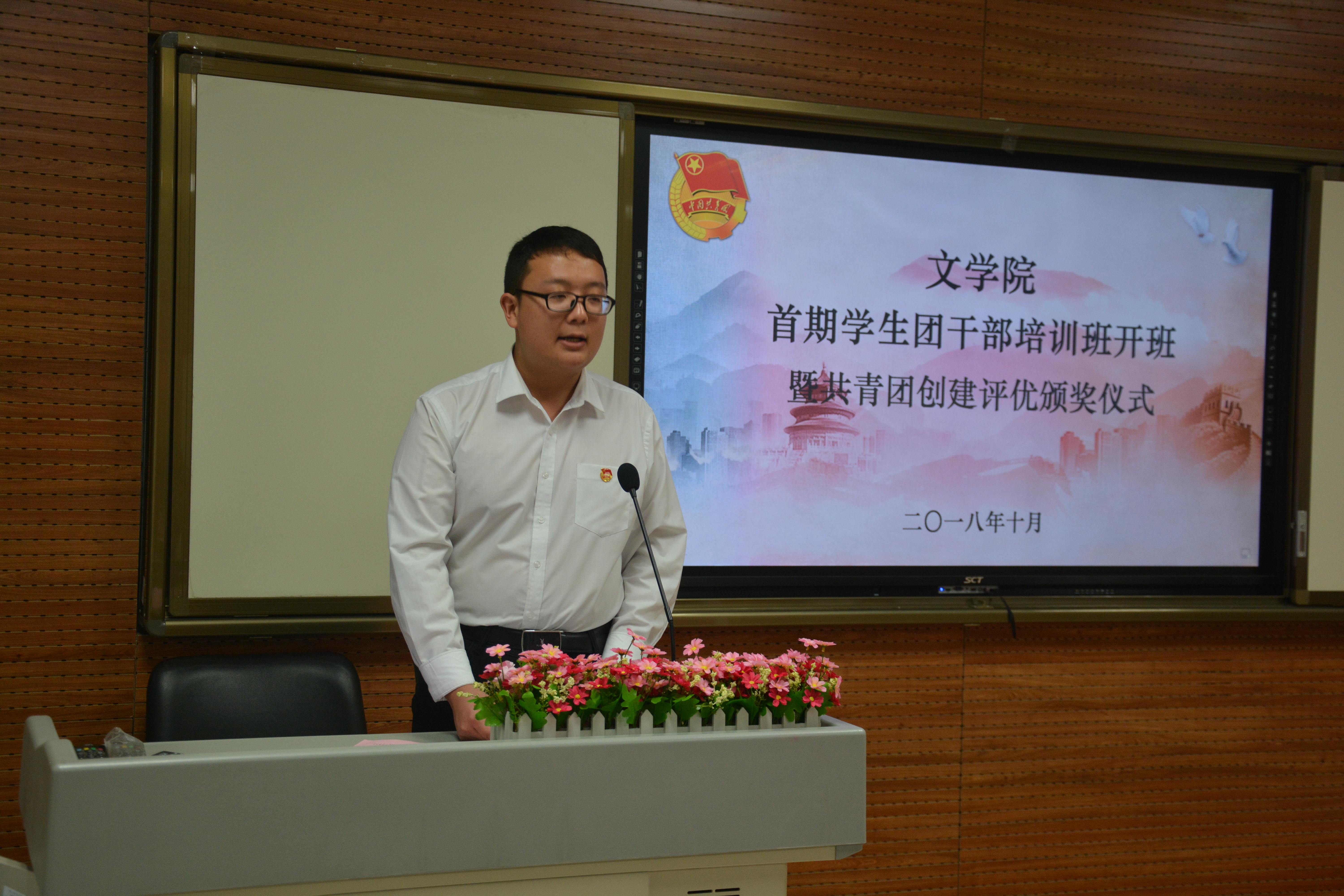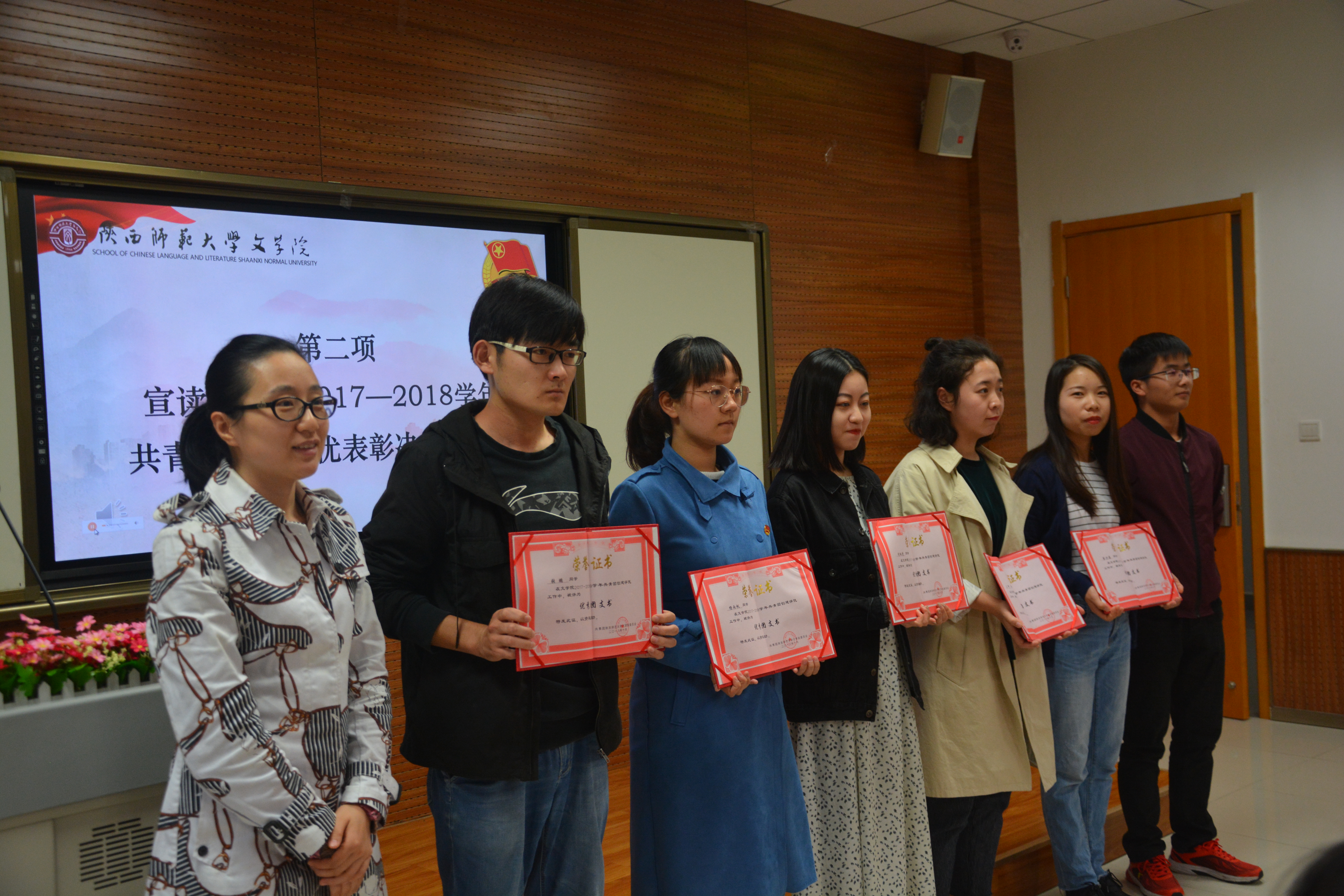 仪式在全体师生整齐嘹亮的团歌声中拉开帷幕。辛田老师宣读公司2017—2018学年共青团创建评优表彰决定。与会老师为2016级汉语国际教育团支部等5个五四红旗优秀团支部、张鹏等5名优秀团支书、周倩等5名优秀团干部、刘淼等5名优秀团员颁奖。