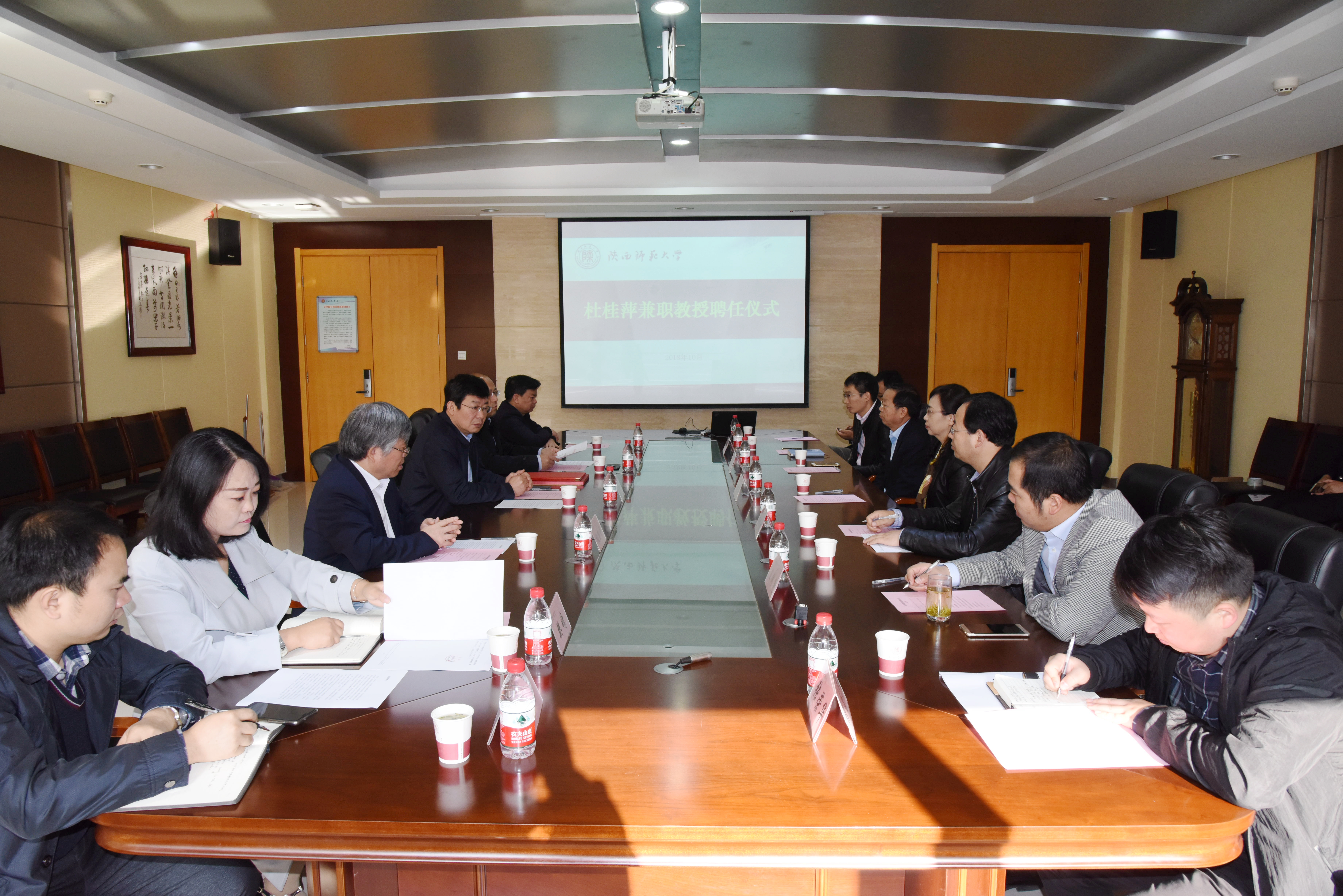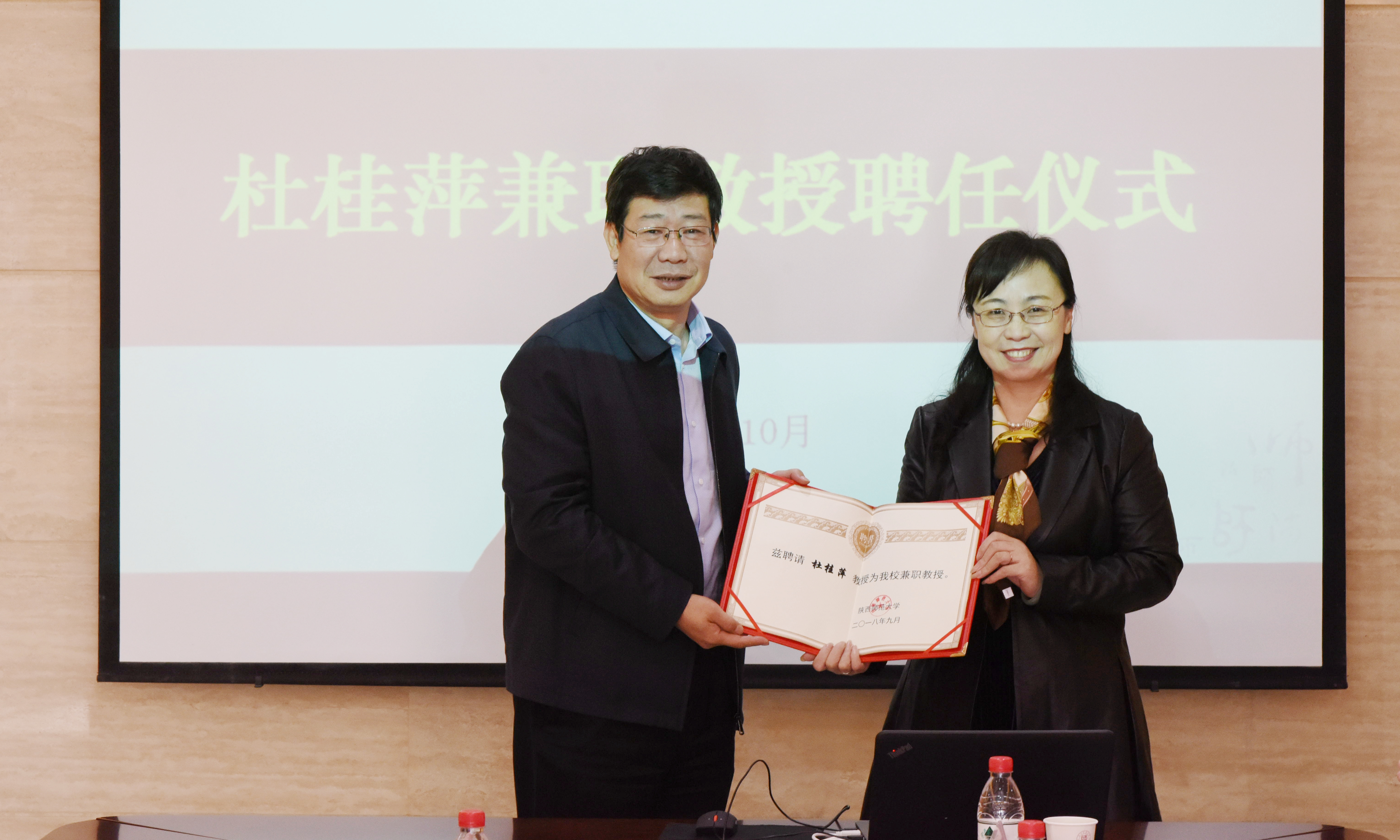 张新科经理首先介绍了杜桂萍教授的主要研究方向、科研成就和学术影响。随后,人事处处长李磊宣读《太阳成集团关于聘任杜桂萍教授为兼职教授的决定》。游旭群董事长为杜桂萍教授颁发聘书。