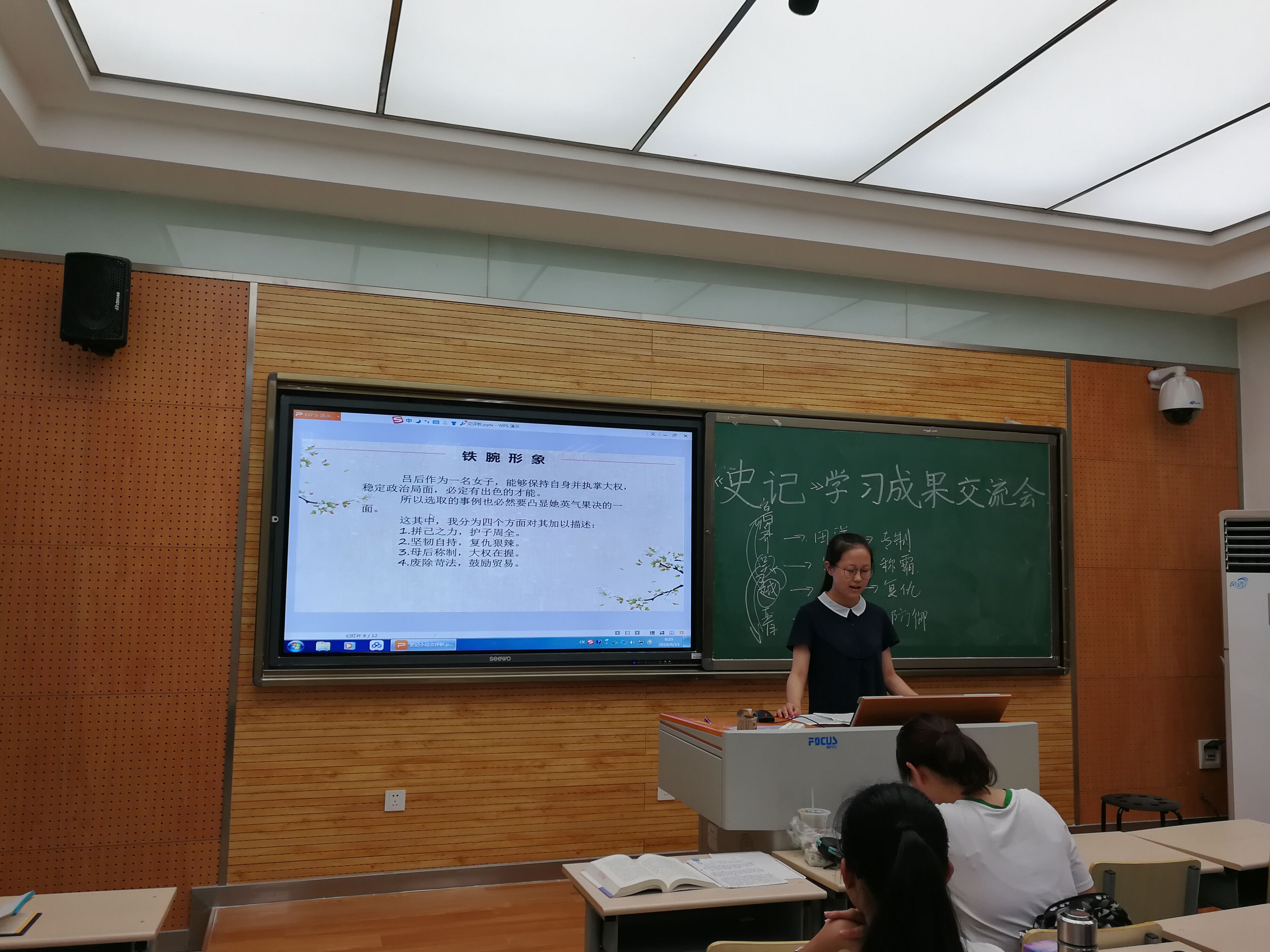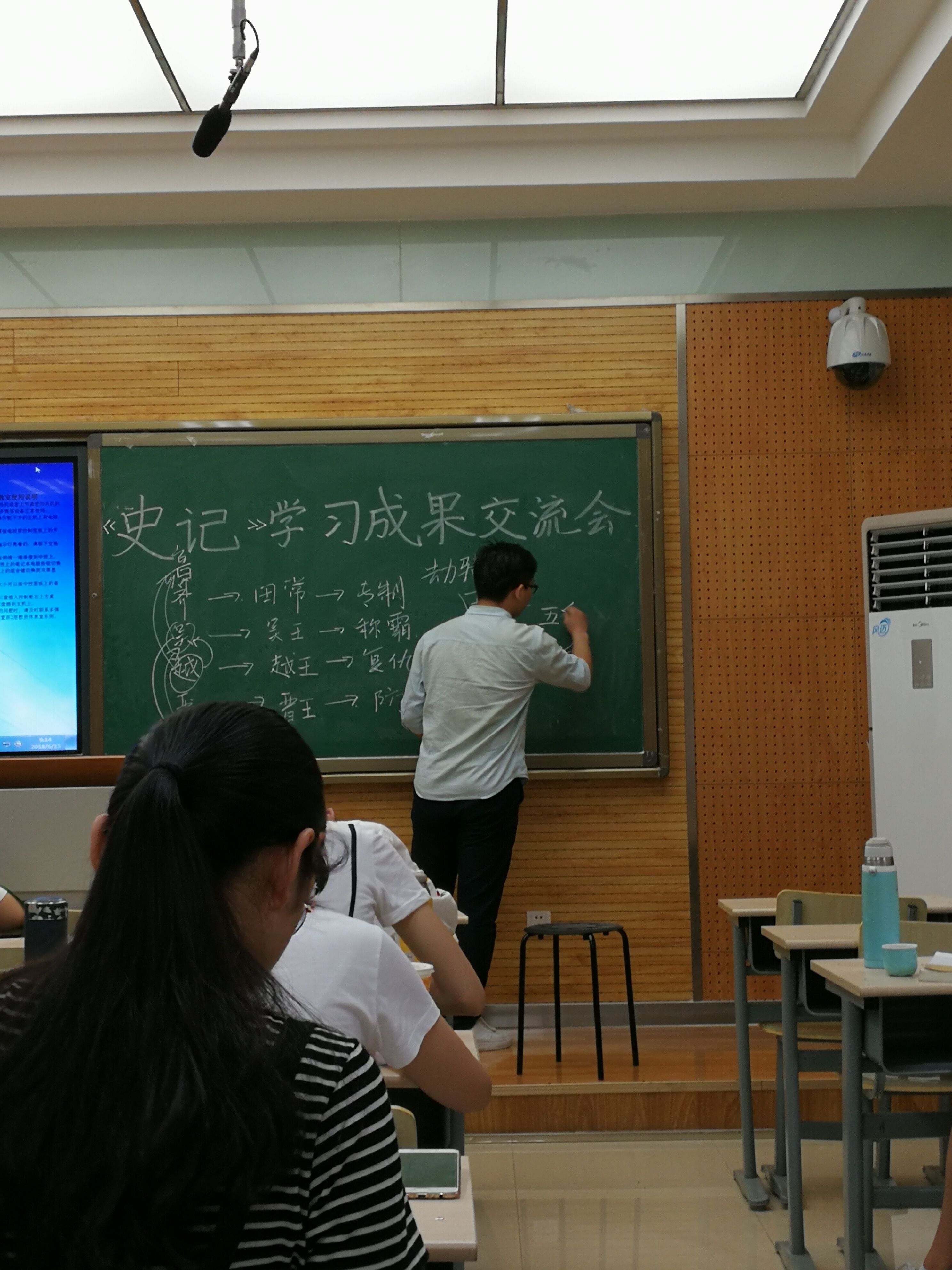 交流会开始,主持人张心宇根据刘老师在作业批改反馈后推选的发言者就发言顺序等做了具体安排,随后就迎来了同学们精彩纷呈的发言环节。同学们以之前所作的《史记》人物传记探究作业为蓝本,分享了自己在研读相关篇章过程中的心得体会与学习成果,吕太后、萧相国、子贡、鲁仲连、商鞅、卫青、田单、乐毅……一个个历史人物在同学们的讲解中都变得生动立体起来,交流中所展现的研究角度和个人立场也对人多有启发,从而有效延伸拓展了课堂教学的内容,弥补了其局限和不足。整个交流会可谓气氛热烈融洽,掌声不断。台上的发言者大方自然侃侃而谈,台下的倾听者则全神贯注,不时常报以肯定的笑声和掌声。将学习的主动权完全交还给员工,是本次交流会最大的亮点。从探究对象的选择到学习成果的展示,同学们都享有着极大的自由空间,在展现个人风格的同时也激发了自主学习的兴趣。从身边同龄人身上学习他们的长处和闪光点,当是本次交流会给同学们带来的最大启发和收获。