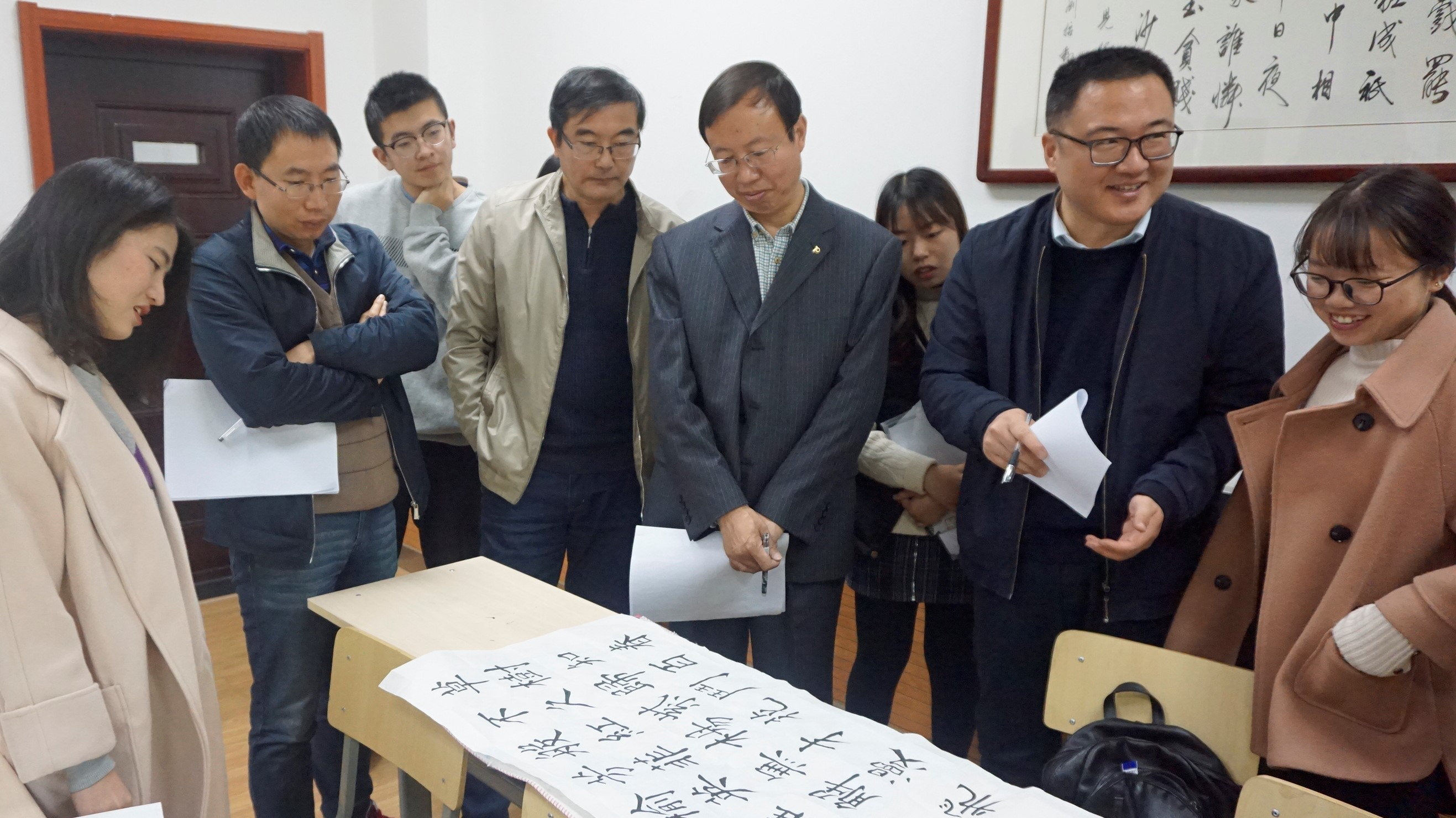 比赛现场同学们凝神聚力,一笔一划,认真对待,在比赛有限的时间和紧张的气氛之下,创造出雄秀端庄、形神兼备的书法作品,展现了参赛同学纯属的书法技巧和扎实的书法功底。在评分环节,老师们在笔画形态、字形结构、作品卷面等方面对书法作品做了点评与指导。王怀中老师强调了汉字书写的笔顺对于字形结构的重要性,提醒参赛同学在练习楷书时要学习行书的笔势,注意笔画之间的顾盼,使书法作品生动、活泼。杨国庆老师特别指出横排与竖排书写时标点的不同,提醒同学们利用好小黑板,勤加练习、不断进步。柏俊才老师、刘银昌老师肯定了参赛同学的审美意趣和书法水平、鼓励公司的同学可以通过书法练习锤炼本领、磨砺意志、陶冶心性、涵养气质。赛场的同学们侧耳倾听、受益颇丰。