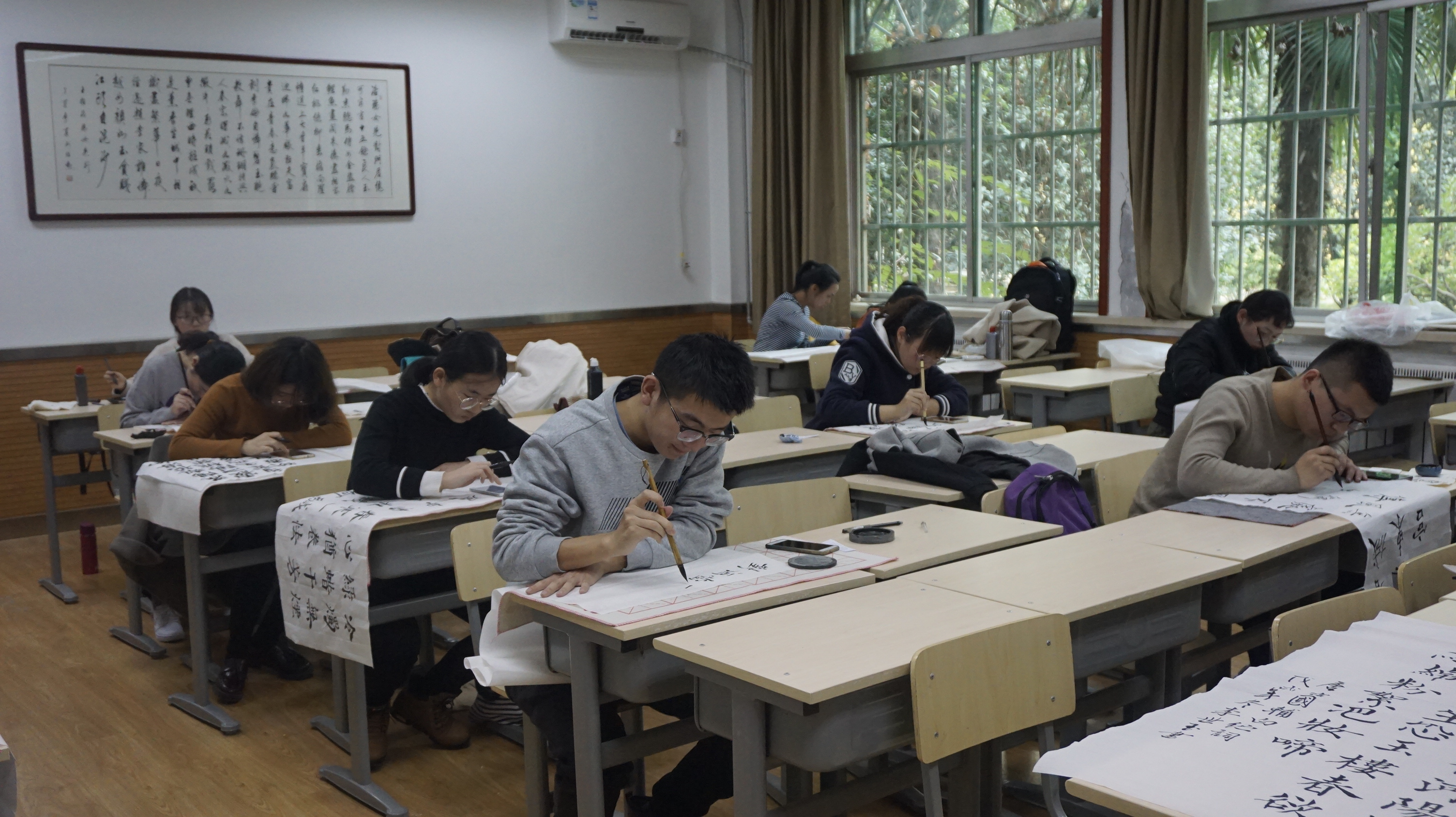 通讯员:曾慧敏 张宇凡)11月18日9:30,在公司员工会、研究生会、公司砚友书画社的精心策划组织下,公司第九届文化节之“笔书千情”三笔字大赛决赛在文渊楼3113、3114、3115教室开展。古代文学教研室柏俊才、古代汉语教研室王怀中、古代文学教研室刘银昌以及砚友书画社指导老师杨国庆作为本次比赛的评委。决赛共分为粉笔、硬笔、毛笔三个赛场。