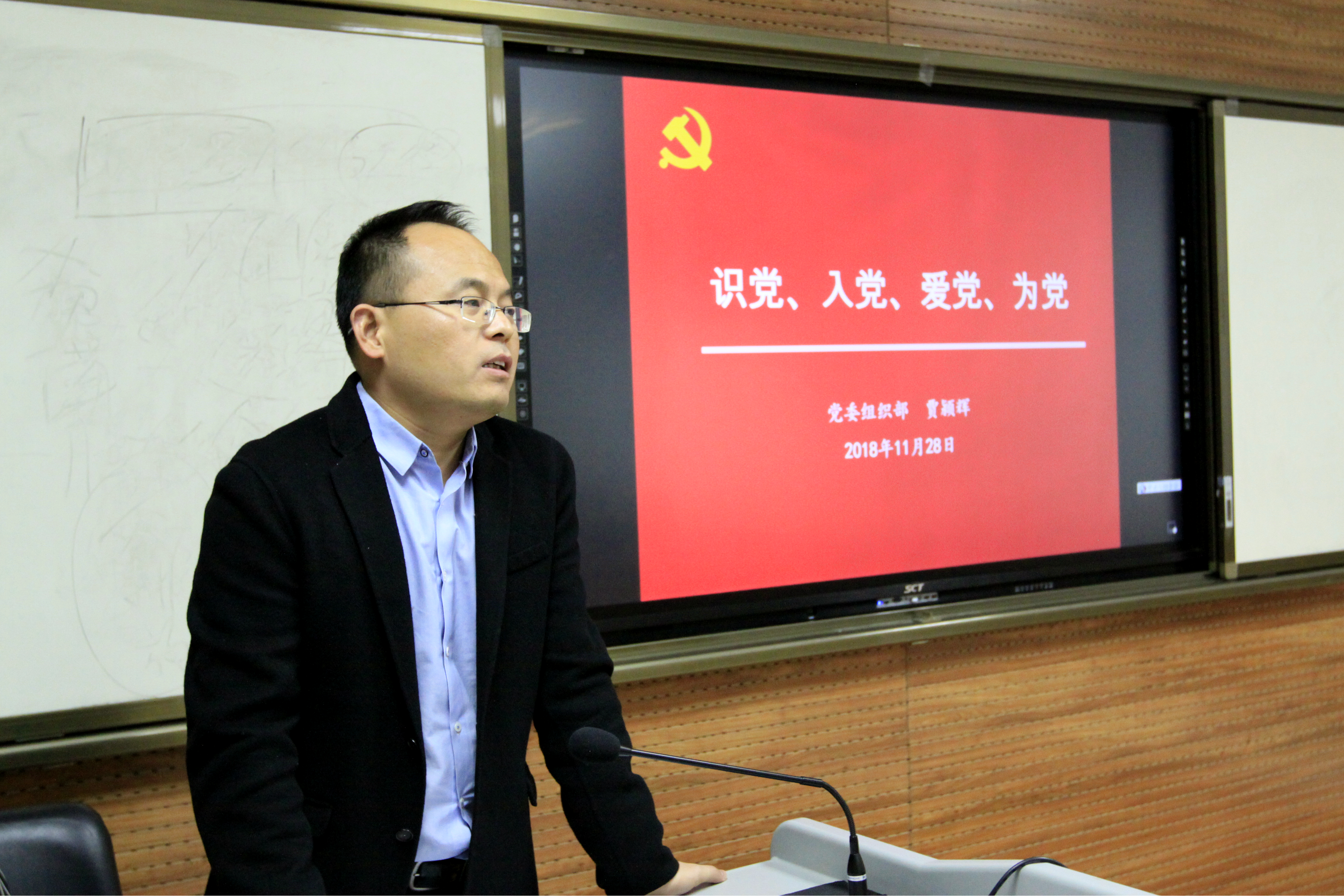 11月28日,党委组织部贾颖辉老师作“党的性质、宗旨和任务”报告,对什么是中国共产党、为什么要入党、怎样入党、如何做一名合格党员的问题作了详细讲解。