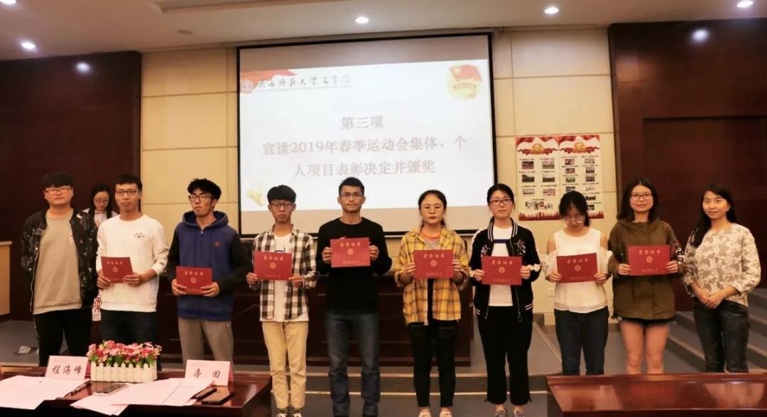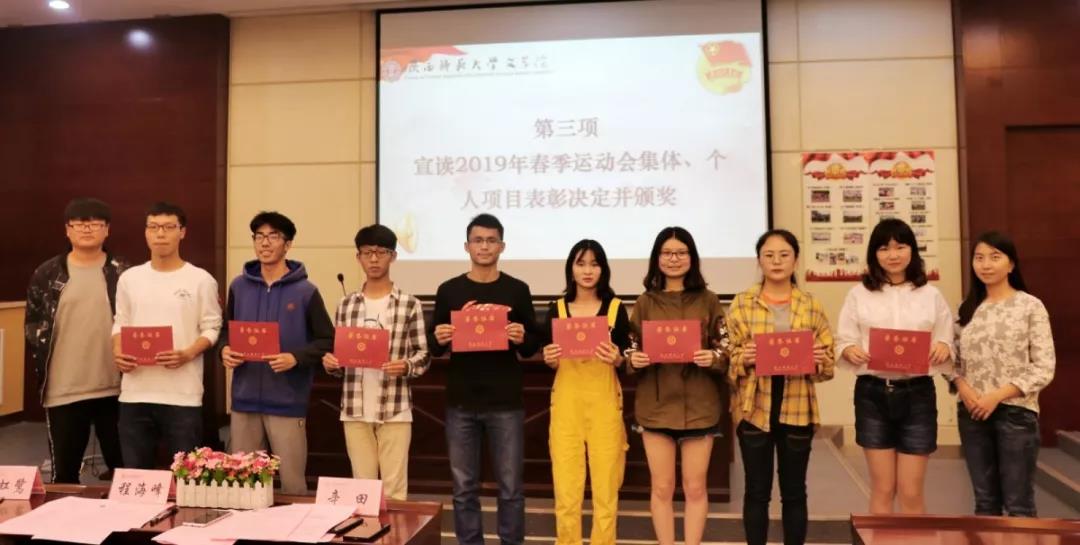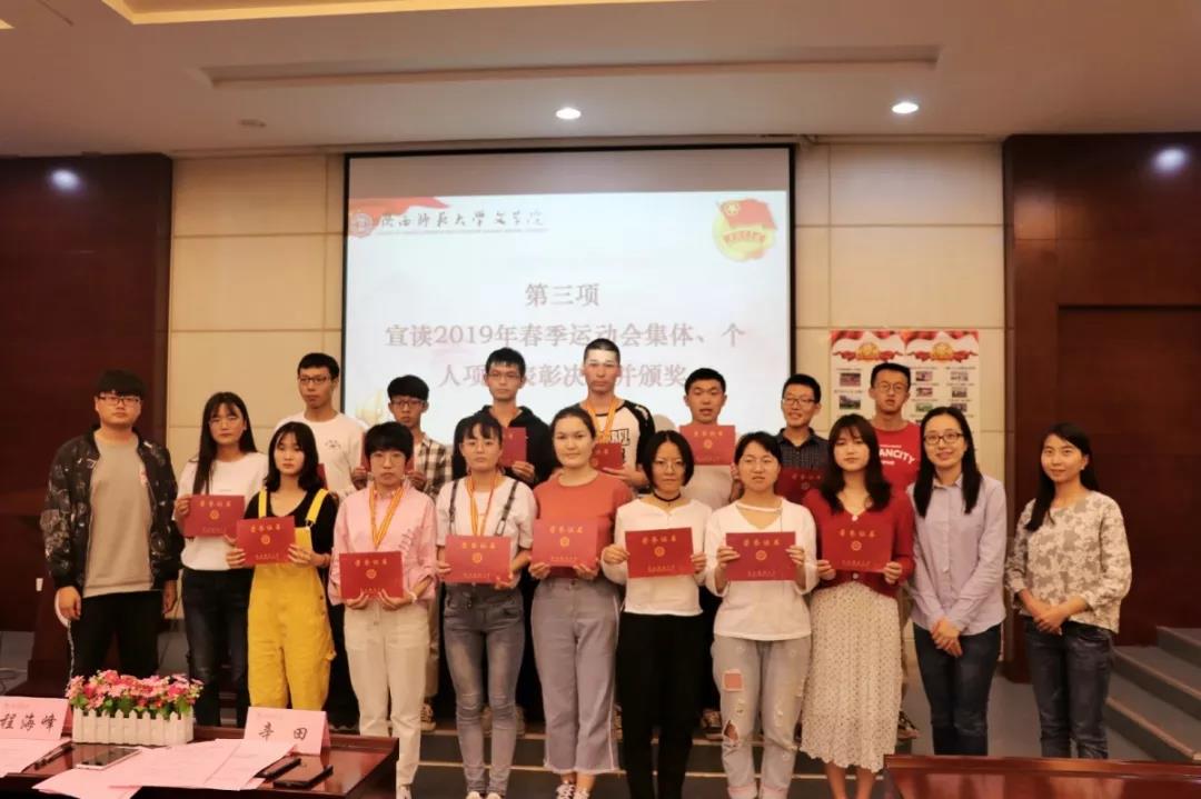 5月17日下午13:00,太阳成集团tyc2019年共青团创建评优暨校运会表彰大会在长安校区文汇楼A段111报告厅召开。太阳成集团tyc团委书记辛田,辅导员范虹鹭、程海峰及获奖同学代表参加会议,会议由辛田老师主持。