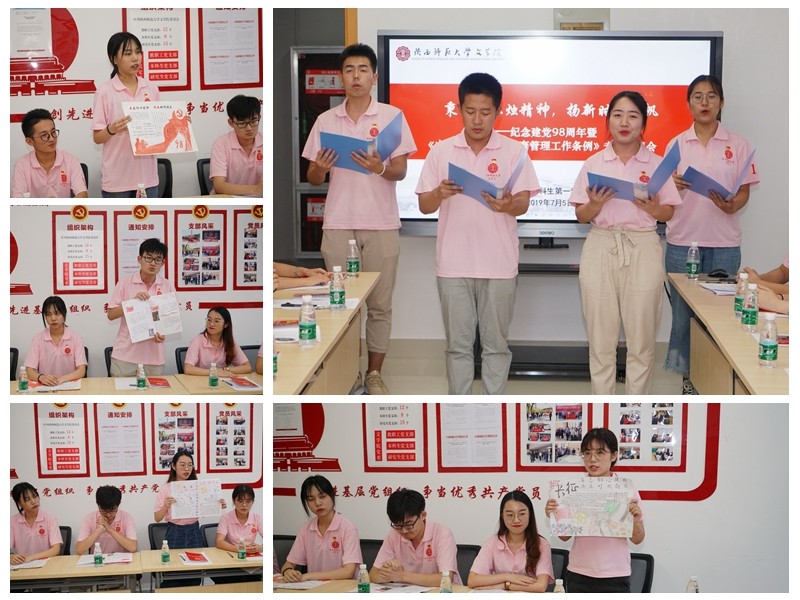 分享感悟后,秦风诗社的同志带来了主题诗歌朗诵。激昂的音乐配合铿锵的诗句,感染着在座每个人的心灵。随后,支部四个党小组展示了纪念建党98周年简报,主题分别是:“做好新时代党员教育管理工作”“向优秀共产党员学习”“学习和回顾党史”“长征精神伴我行”,传递了支部党员的理想信念,激励全体党员不忘初心,在新时代奋勇前行。