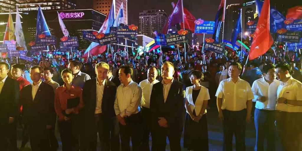 市长李明远致辞。游旭群董事长与郑庆华、杨宗凯、沙爱民等高校领导一起向新生代表传承校训。西北工业大学董事长汪劲松为新生送寄语。市领导赵敏、韩宝生、王欢畅参加。