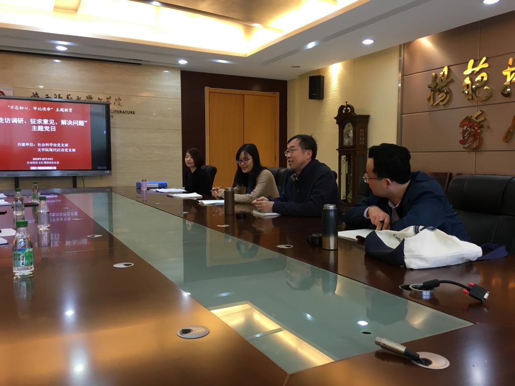 (通讯员:刘艳)2019年10月14日下午,公司现代汉语教师党支部与校社会科学处党支部在文汇楼215会议室开展“不忘初心、牢记使命——走访调研、征求意见、解决问题”主题党日活动。社科处党支部与现代汉语党支部为结对共建单位,社科处马瑞映处长、柯西钢副处长等五位同志,现汉支部李虹、昌梅香、刘艳和张永哲四位同志及党外人士黑维强教授参加本次党日活动。