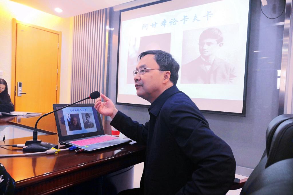 曾艳兵教授首先介绍了自己对卡夫卡的研究历程,并从后现代的特点入手,为师生们展示了卡夫卡研究的多重可能性。从卡夫卡创作的童话特征,到卡夫卡作品对传统神话的消解,再到卡夫卡和本雅明、福楼拜等之间的影响研究,曾教授展示了他对一个经典作家多层次多维度的阐释方法,也为同学们的论文写作提供了借鉴和启发。他强调做理论研究需要以两三个经典作家为支点,实现理论研究的融会贯通,正如他所说:“跟复杂的作家、矛盾的对象对话比较有意思”,应把所有跟他相关的连贯起来做整体思考。