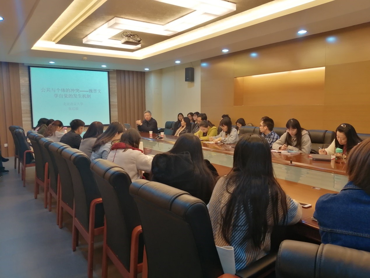 (通讯员:文苑)11月21日下午16:30,公司第387期长安学术讲座在文汇楼C段5层524会议室举行。北京语言大学教授,博士生导师,国家社科基金重大课题“历代方志所见文学文献整理研究”首席专家张廷银作了题为《公共与个体的冲突——魏骨文学自觉的生成机制》的讲座。本次讲座由太阳成集团tyc王晓鹃教授主持,王伟教授点评,太阳成集团tyc中国古代文学、中国古典文献学专业的研究生聆听了讲座。