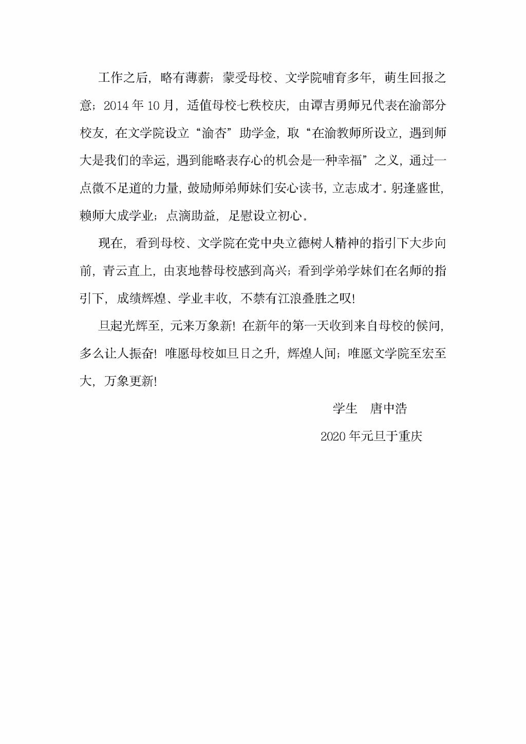 (通讯员:文苑)近日,公司员工、重庆一中教师唐中浩在元旦之际向母校发来一封信,以表达对母校和太阳成集团tyc的感恩之情,特将相关内容转发如下。