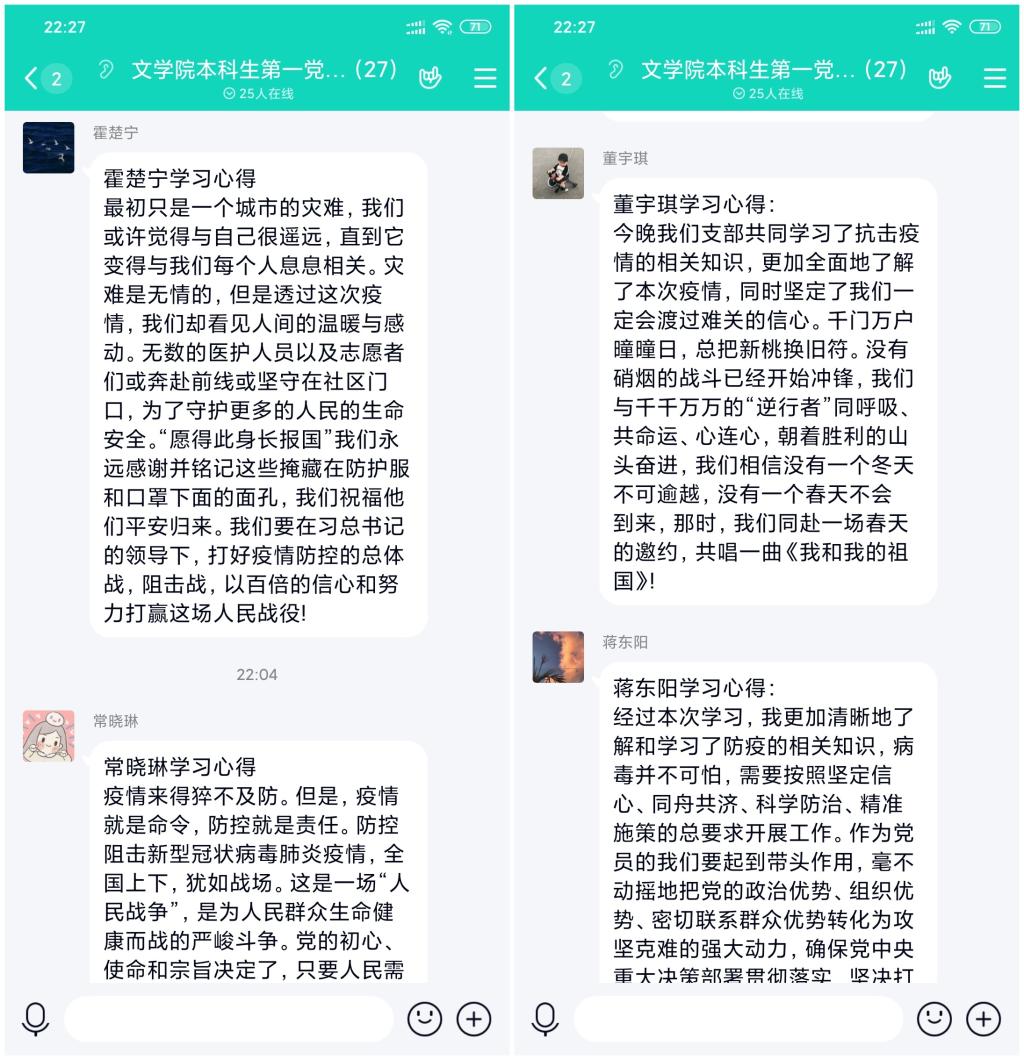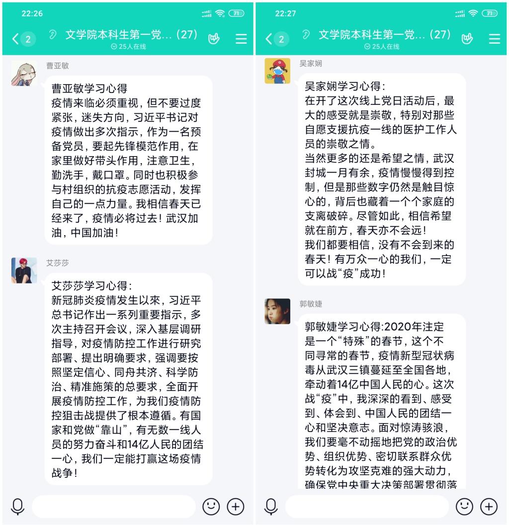 支部党员还分享了居家期间的学习、生活安排。居家期间,支部党员对时间进行了合理、细致的规划,在展开线上课程学习的同时加强身体锻炼,提升自身素质和专业技能,做到劳逸结合、秩序井然。最后,在支部党员“为武汉打气,为中国加油”的祝福中顺利结束本次党日活动。