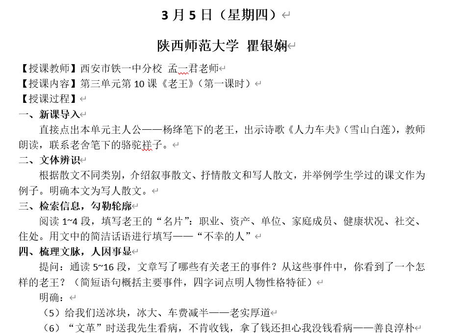 2.撰写教学设计,注重三个环节。指导两位实习同学进行教案写作。教案中首先要体现的是教学目标,教学目标是整个教学设计的指引,涉及三维目标以及语文核心素养,并且要难易搭配,突出重点。其次,最重要的是教学过程的安排,在教学过程中落实教学目标。最后,作业的布置也极为关键,不能让作业流于形式。