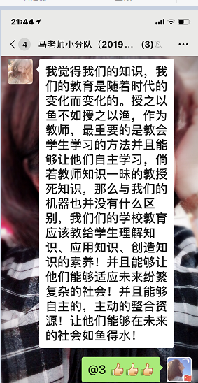 2.加入“语文教师QQ助学群”,理论与实践相结合,线上展开实习研修。于红梅老师组建了以未央区任教七、八年级语文教学老师为主的“未央区七、八年级语文助学群”,以QQ群分组,开展网络研课研学,合作交流,助学提升。将两位实习同学也加入到群里,使其与群组里的所有语文老师共同开展每日的教学活动,按计划学习教学理论,关注网络微课制作,听课评课、撰写感悟心得,汲取学养。在灾难和不幸面前,以更为开阔的视野融入到整个未央区中学语文课程的教学实践当中。