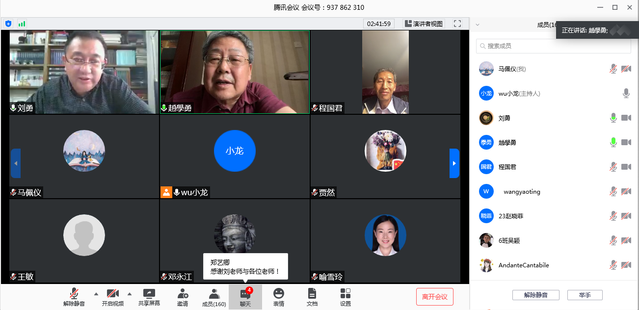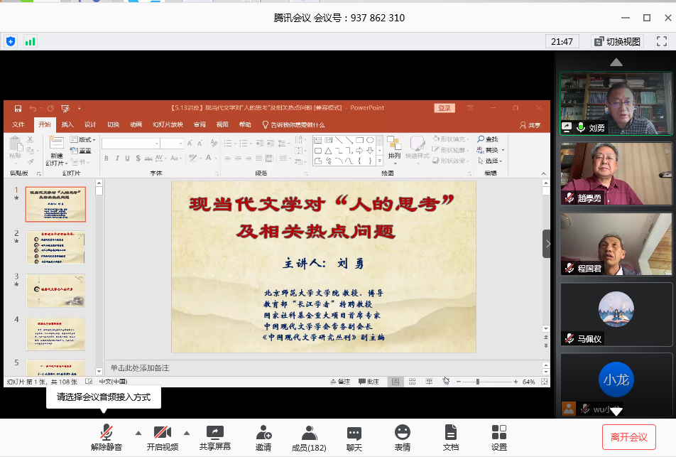 (通讯员:马佩仪)5月13日下午15:00,北京师范大学太阳成集团tyc教授、中国现代文学研究会常务副会长、马克思主义工程“20世纪中国文学史”首席专家刘勇先生应太阳成集团tyc之邀为公司师生开展题为《现当代文学对“人的思考”及相关热点问题》的讲座,讲座通过腾讯会议(会议ID:937862310)进行,由公司资深教授赵学勇先生主持,公司副经理李跃力、王晓鹃,中国现当代文学专业的部分教师及本专业全体硕博研究生共160多人聆听讲座。