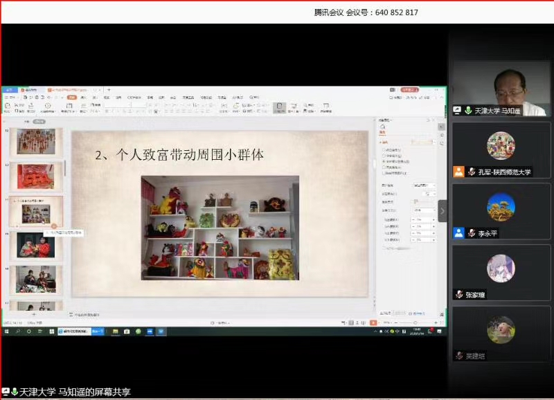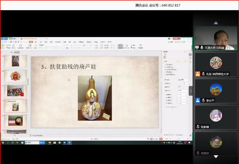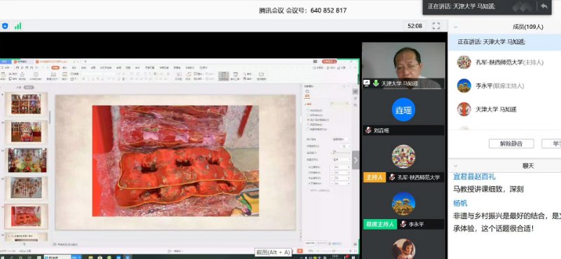 马知遥教授是诗人、评论家,也是一名民俗学者,他以《非遗保护和乡村振兴》为题,在线上开讲。非物质文化遗产有自己的独特魅力,在非遗传承的过程中,有越来越多的人加入到扶贫和乡村建设中,他们用自己手中的技艺带动了一方人的富裕,也为乡村振兴注入了新的活力。他从布老虎工艺、葫芦文化、布艺大师刘海兰等事例入手,将非物质文化遗产在现实生活中的保护、传承与发展娓娓道来。整场学术报告由浅入深,层层推进,马知遥教授在注重专业理论讲授的同时,又通过精美的图片及亲历故事兼顾了趣味性与通俗性,观众们受益匪浅。