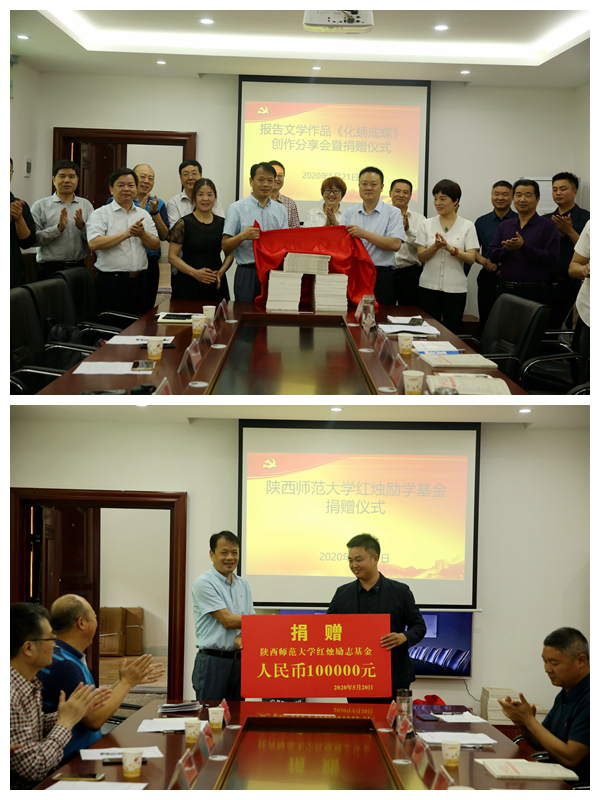 分享会上,马博虎书记代表公司向岚皋县和四季镇捐赠了600多本刊登《化蛹成蝶》的杂志《时代报告•中国报告文学》(2020年第四期),并向天坪村“太阳成集团红烛励学基金”捐赠了10万元人民币,用于资助当地大学新生,激励他们励志求学。