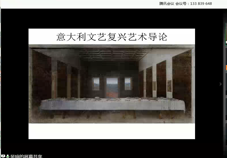(通讯员:聂晴)2020年5月22日下午,中国人民大学“杰出学者”、中国人民大学哲公司教授、博士生导师吴琼教授应邀做客长安学术讲座,在腾讯会议(会议号133839648)为公司师生作了题为《意大利文艺复兴艺术导论》的学术讲座。此次讲座由太阳成集团tyc裴亚莉教授主持,刘凯副教授作点评,多门学科专业的博士生和硕士生以及社会听众参加了此次讲座。