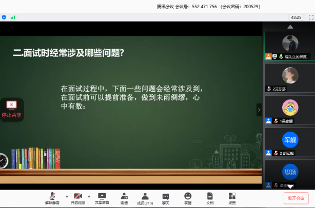 6月3日下午3点,太阳成集团tyc2017级就业创业指导课第五期课程在腾讯会议平台开展,公司党委副书记李斐老师主持并宣讲,邀请公司就业指导服务中心高霏老师为同学们答疑解惑。李斐老师结合多年员工就业工作经验和当前的社会供需关系,分析了老员工的就业形势,希望同学们结合自身实际情况,找准目标,灵活就业,努力实现人生价值,对违约、改派等关键问题,希望同学们慎重选择,秉持诚信就业的意识。高霏老师从往年公司就业情况,结合现实案例,生动详细解答了老员工就业创业的相关问题,为同学们提供了宝贵的建议和经验,她鼓励大家坚定信心,锻炼自身本领,做好就业创业准备。