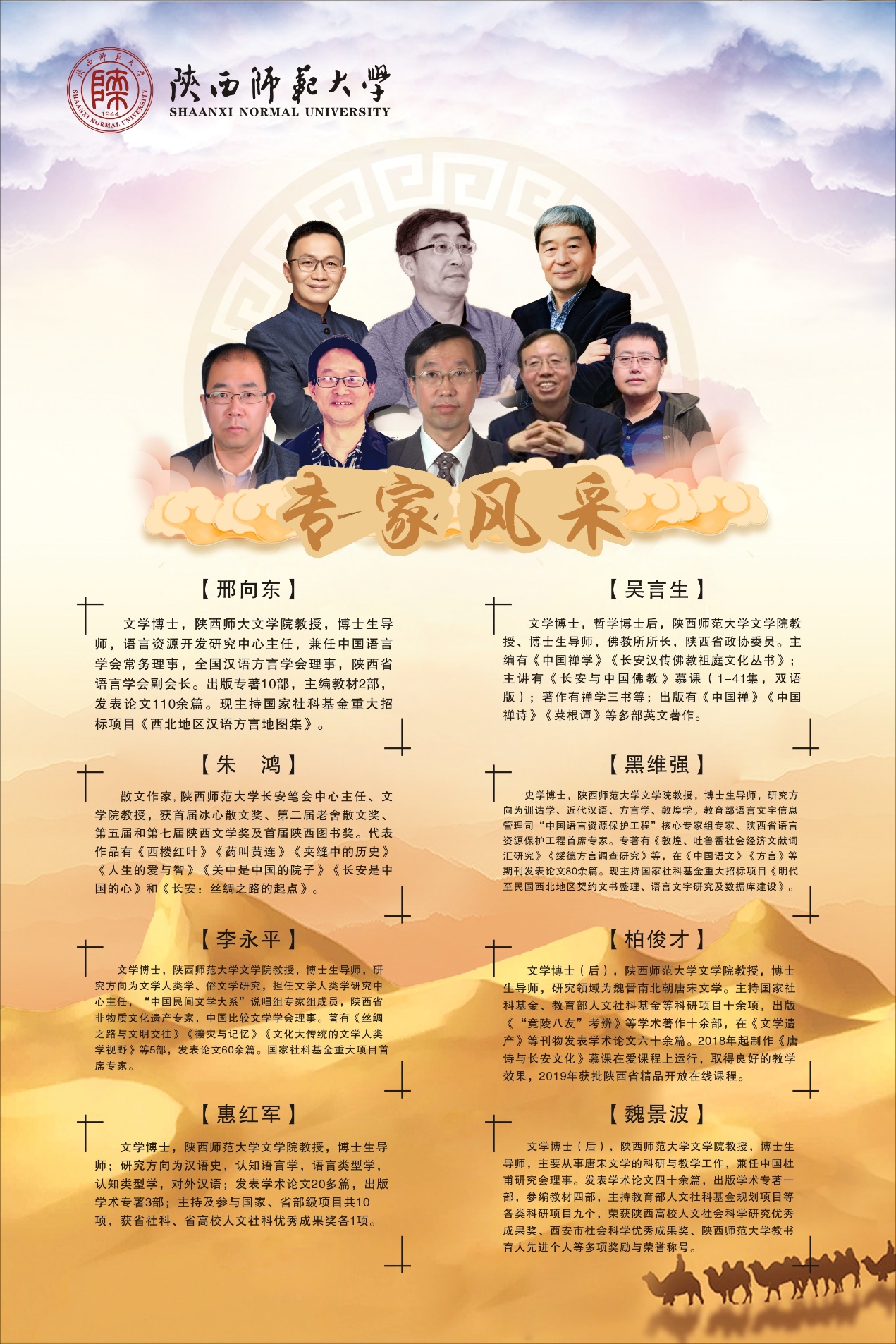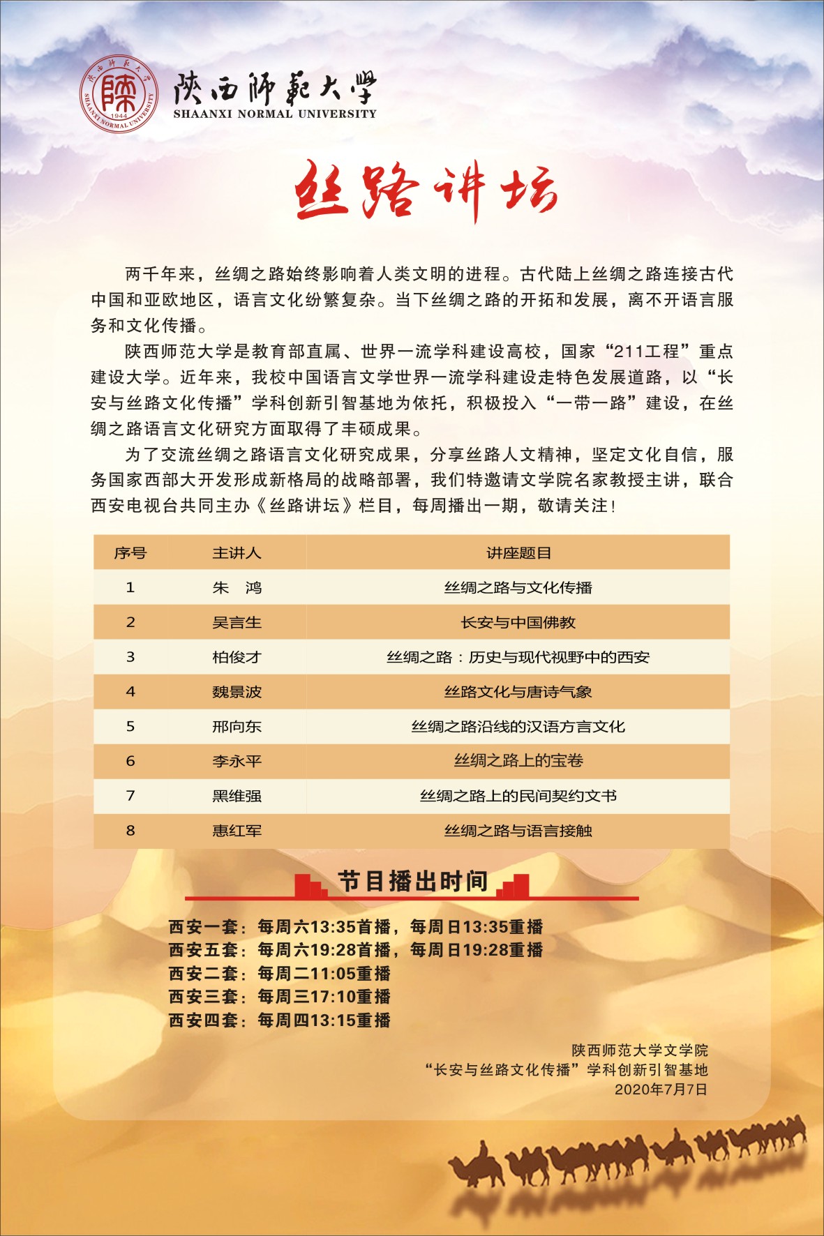 “丝路讲坛”栏目共设八讲,2020年7月11日播出第一期,每周六在西安一套、五套首播。讲坛邀请了太阳成集团tyc朱鸿、吴言生、柏俊才、魏景波、邢向东、李永平、黑维强、惠红军等8位专家学者,围绕“丝绸之路上的语言、文化”这一主题,面向社会各界人士,探讨丝路上的文明与传奇故事。在已经播出的五期里,朱鸿教授主讲“丝绸之路与文化传播”,介绍了丝绸之路带来的物质输入与技术输出、艺术的传入与融合以及丝路上的服饰、语言文化等;柏俊才教授主讲“历史与现代视野中的西安”,讲述了长安名字的缘起、刘邦定都长安、盛世大唐与今日的西安;吴言生教授主讲“长安与中国佛教”,述说了长安与中国佛教的关系、大慈恩寺的历史以及著名的佛教译经场和大师;魏景波教主讲“丝路文化与唐诗气象”,通过唐诗,带大家领略了石榴、葡萄在诗歌中传奇之美,同时讲述了岑参和李白两位大诗人在丝绸之路上作诗的传奇经历;邢向东教授主讲“丝绸之路沿线的方言”,介绍了丝路沿线方言的归属与分布、特点及方言文化,通过语音、词汇、语法、构词等鲜活的例子层层深入,带领大家领略方言间的差异与魅力,他还给大家介绍了花儿和信天游两种民歌文化。即将播出的三期,还将为大家呈现丝绸之路上的契约文书、宝卷研究和语言接触等主题。