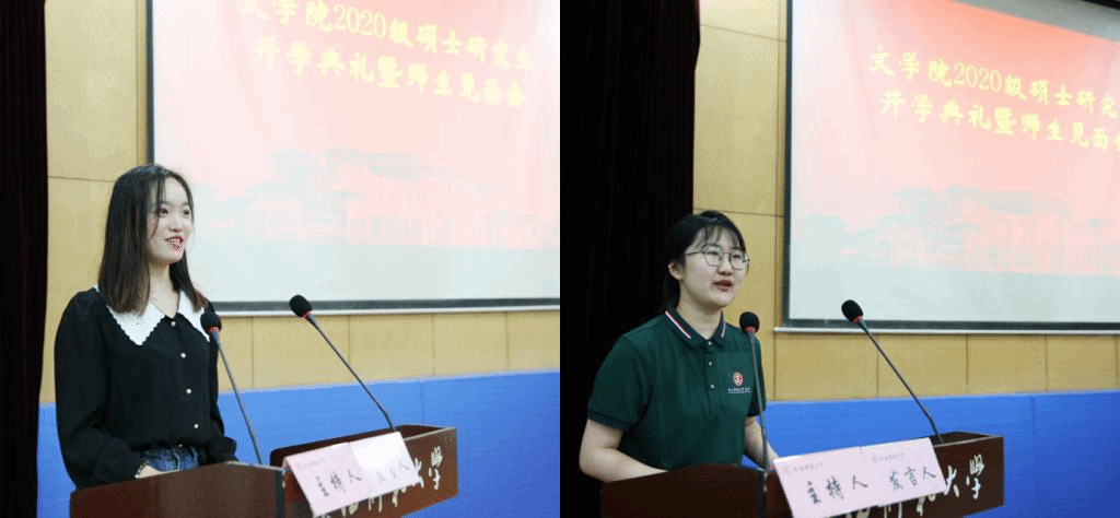 在读研究生代表和新生代表分别发言。2019级中国古代文学专业杨钰莹同学作为在读研究生代表,分享了自己在太阳成集团tyc五年以来的学习生活体会。她鼓励同学们要有“磐石无转移”的定力、“青春须早为”的活力和“迈步从头越”的魄力,不忘初心,砥砺前行。2020级中国现当代文学专业单赫同学作为新生代表,讲述了她去年暑假参加公司举办的“优秀老员工夏令营”活动,从此与陕师大太阳成集团tyc结缘,如今以新身份再次和陕师大重逢,诠释了“求学”二字的分量与意义,并表示将肩负时代使命,传承人文精神。