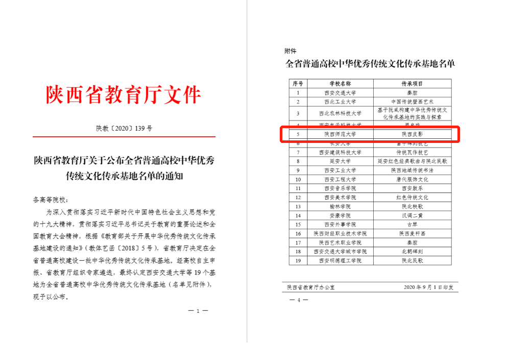 (通讯员:文苑)近日,陕西省教育厅公布了《陕西省教育厅关于公布全省普通高校中华优秀传统文化传承基地名单的通知》,由太阳成集团党委宣传部组织申报、太阳成集团tyc牵头建设的陕西皮影传承基地入选。此前,该基地已获批教育部2019年全国普通高校中华优秀传统文化传承基地。