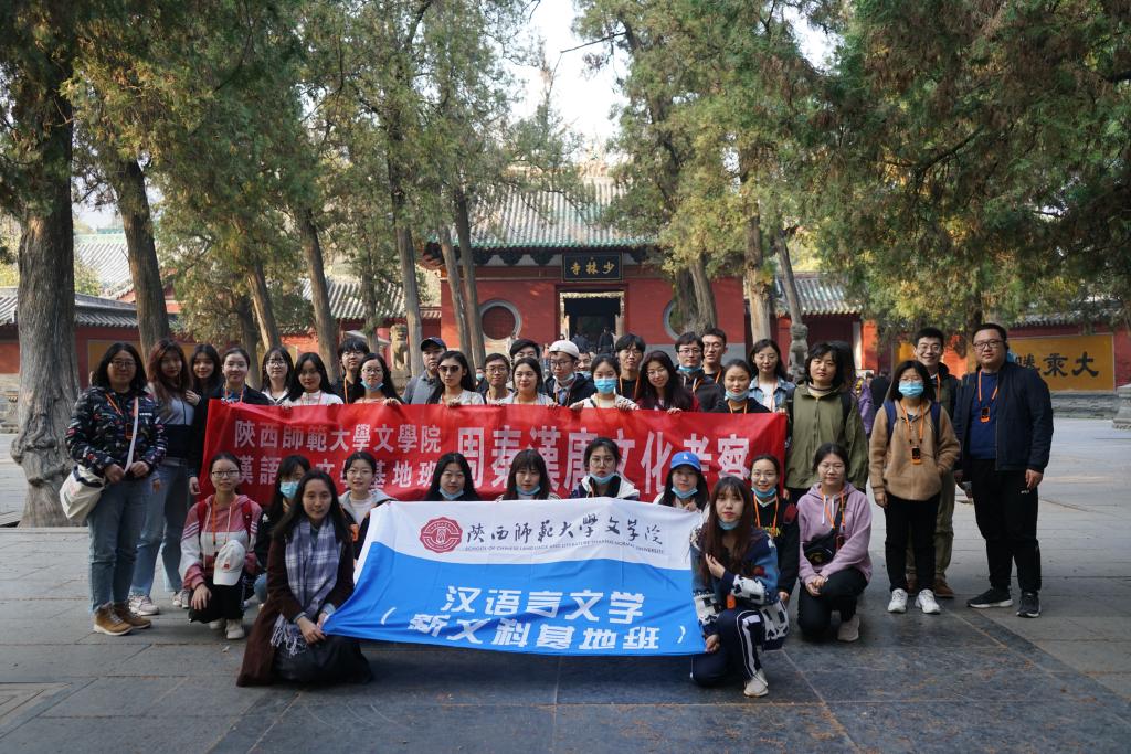 在考察行程中,老师同学们与讲解员齐诵诗文,同论史事,脚下一步一印皆藏有诗情画意,眼前一光一影都仿佛是往事重现。悠悠梵音,萧萧玉树,千年古刹,万世春秋……无论是静默不语的僧人,还是熙熙攘攘的行人,都持一瓣心香而来,为这寂寂嵩山林增添了许多生意。从魏晋南北朝的楼台烟雨,到唐诗宋词里的吟咏叹息,再到明清之际的皇家题词,再到近代民国的炮火纷纭……一座少林寺,便是一段中国历史的缩影。佛教、武术、政治、军事、文学……历史的多重面相交织重叠在一起,启人深思。师生们边游边学,亦行亦思,向外观览了万千动人美景,也向内烛照着自我的心性。