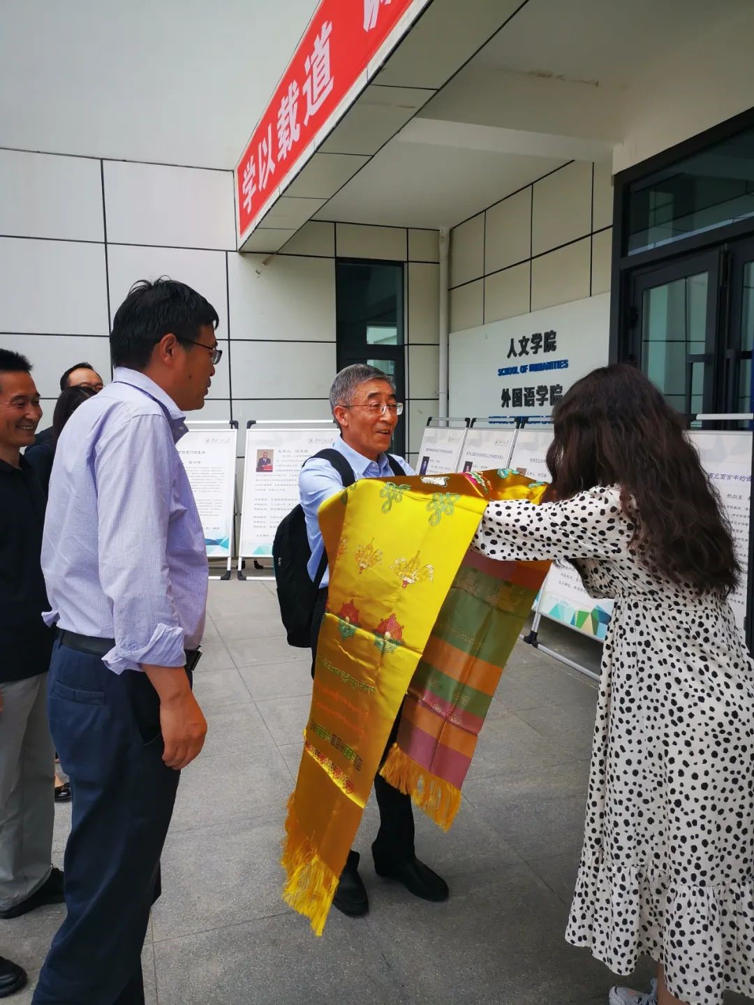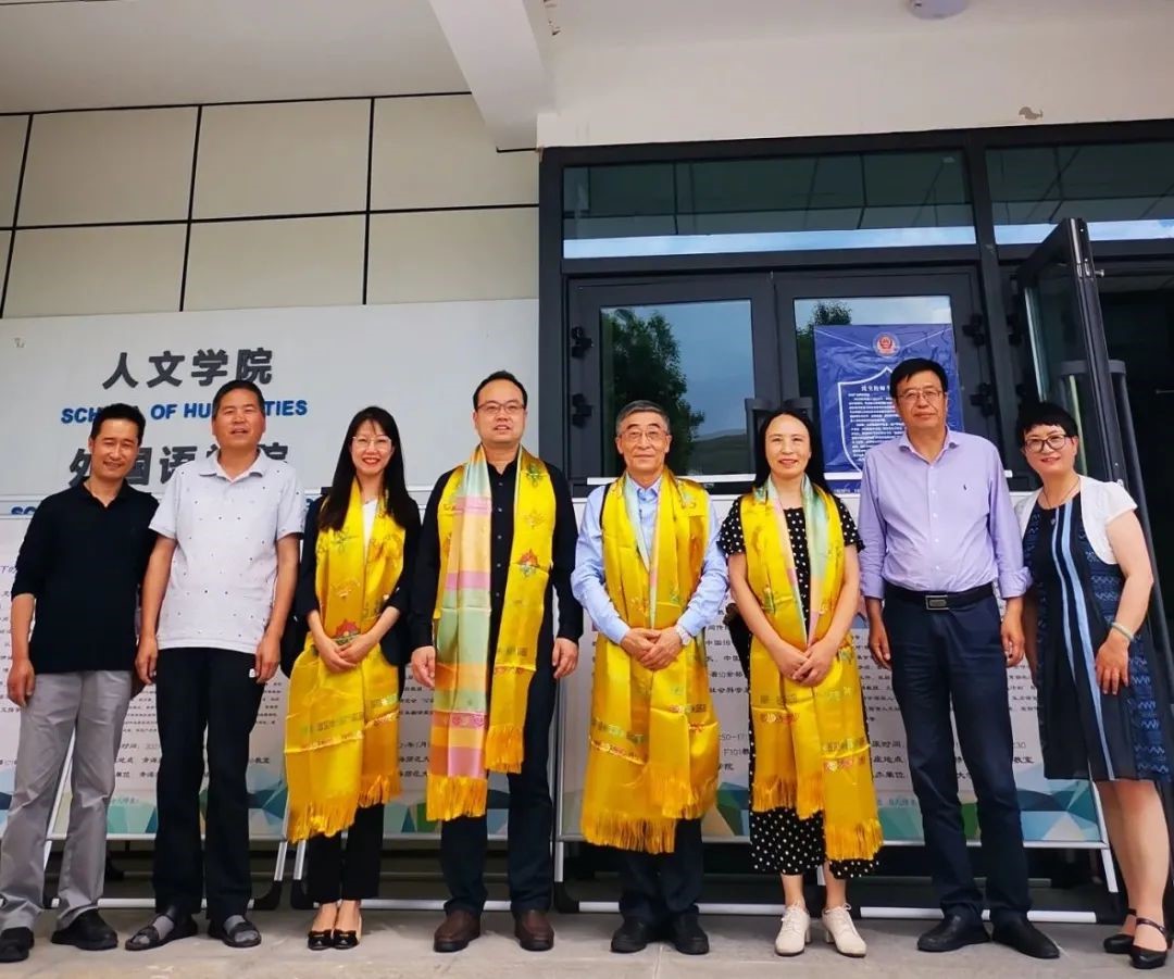 青海师老员工代表为陕西师大邢向东教授一行献上金色哈达