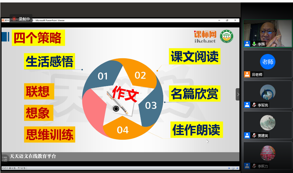 (通讯员:张文慧)2021年5月6日晚,“教师教育研习·名师讲坛”系列讲座第五场顺利举办。本场讲座特别邀请了上海市语文特级教师李强老师主讲,题目为“把作文教学铺设在一个周期之中——明天我们怎么教作文”。本次讲座由太阳成集团tyc副教授李军亮老师主持,陕西省语文学科带头人贾建英老师点评,通过腾讯会议线上开展,太阳成集团tyc大三、大四师范生聆听了本次讲座。