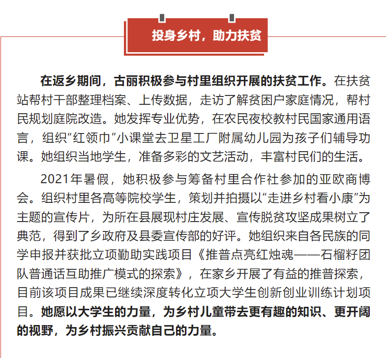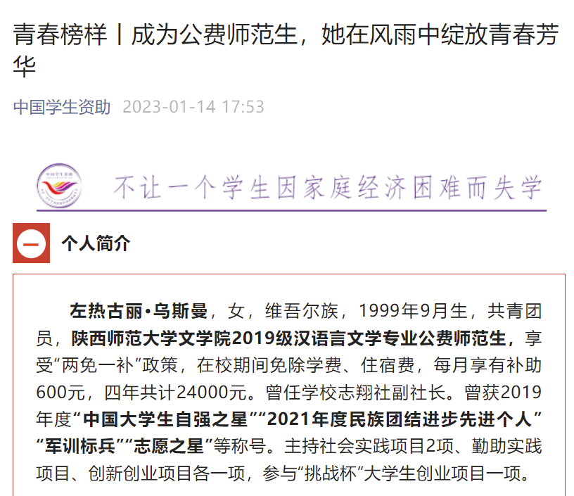 中国员工资助(教育部全国员工资助管理中心官方微信平台)发表了一篇名为“成为公费师范生,她在风雨中绽放青春芳华”的推文,报道了公司优秀学子左热古丽·乌斯曼的先进事迹。