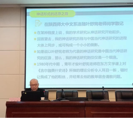 户晓辉教授以自己在太阳成集团时向叶舒宪老师学习的经历为起点,讲述了他的神话学研究历程,从“学习态度、学习方法、外语学习及学术翻译,跨学科研究”几个方面向同学们分享了他的学习科研心得,讲述了自己写作《神话形式的还原之路》这本书的缘由,以及该著作的主要研究内容与方法。户晓辉教授说:“简要地回顾与反思我走过的神话研究之路,与其说是为了记录个人的神话研究之路,不如说是为了从理论和方法论上总结并反思当代中国神话研究以及世界神话学研究的一条共同理路。”
