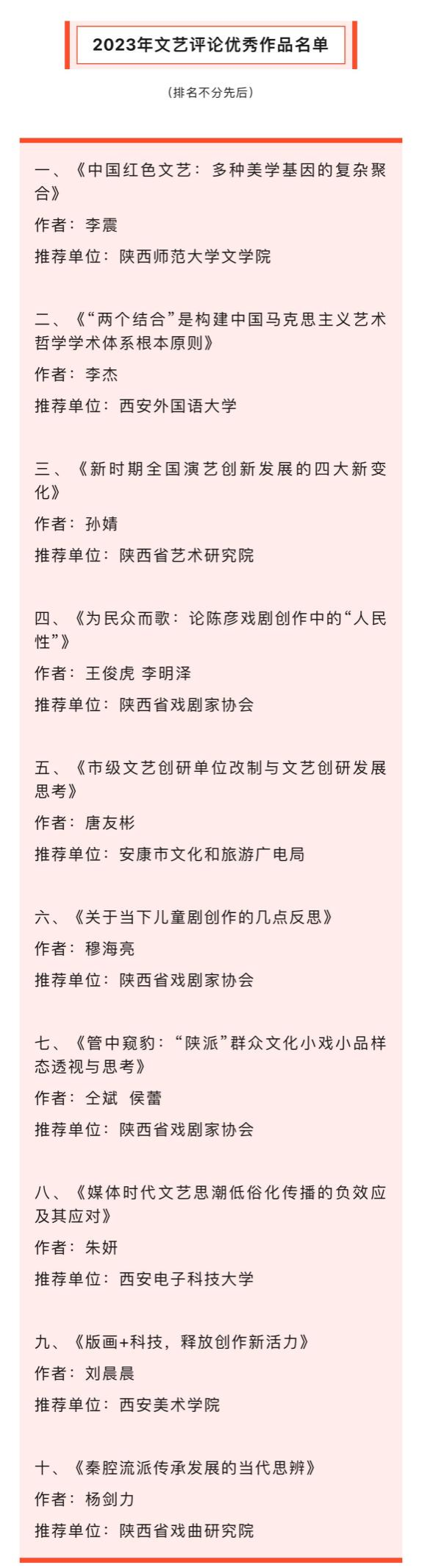 2月6日,在国家文化和旅游部2023年优秀文艺评论征集活动中,公司李震教授的论文《中国红色文艺:多种美学基因的复杂聚合》由陕西省文化和旅游厅组织专家评选为2023年文艺评论优秀作品,并被选送国家文化和旅游部。