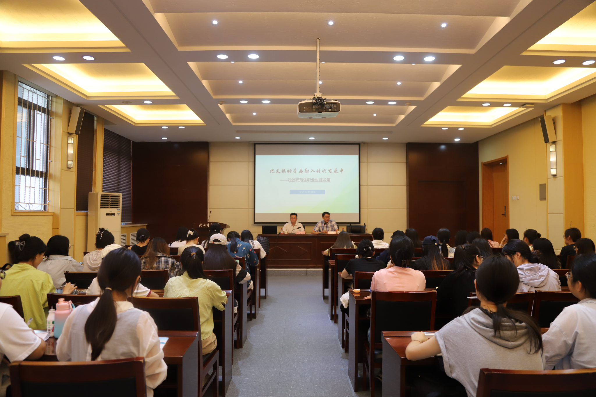 赵海龙以“把火热的青春融入时代发展”为题,从两方面分享了个人从教经历和职业规划经验。一是要坚守教育初心、践行“西部红烛 两代师表”精神,他以自身扎根果洛高原的经历,阐述了实现自我价值对于探寻人生道路的意义,强调了保持专注、深耕专业发展的必要性。二是要开拓国际视野,涵养世界情怀。他以担任玛沁县第一民族中学董事长期间的教学改革为例,展现了创新、自信、开放的教育理念。
