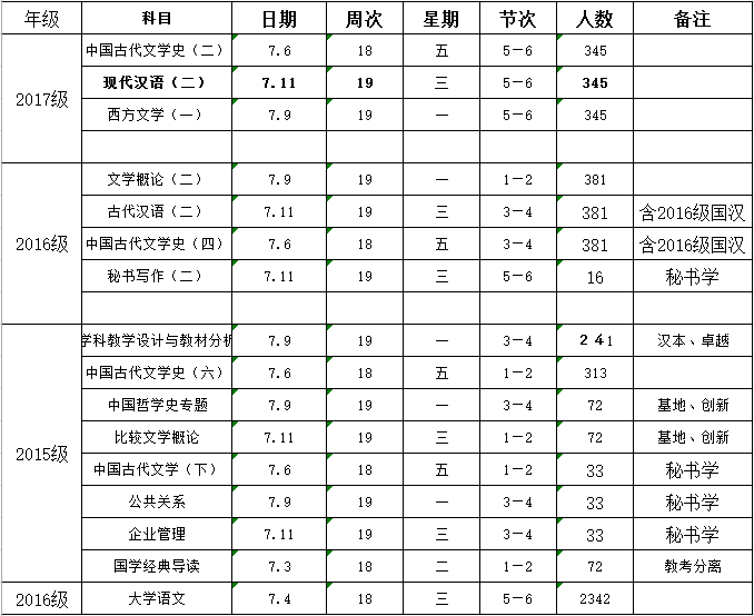其它未出现课程,均在第17周,随堂考试,必修课需按模板出题。不在同一时间的考试,应用不同试题。选修课由任课教师自行决定。试题及答案,打包发教学办公室。