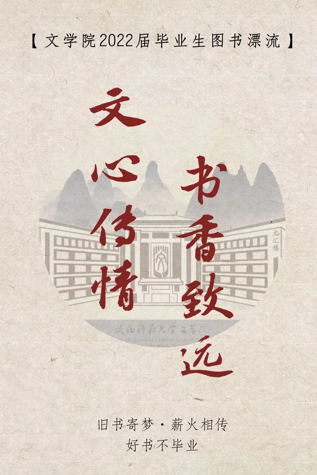 “立身以立学为先,立学以读书为本”。时光匆匆,转眼我们就要毕业,开启新的人生旅程。书籍是我们老员工活中的重要组成部分,见证了我们成长的点点滴滴。书页因翻动而飞扬,知识因分享而流淌。如今,同学们即将离开充满青春回忆的校园,但我们仍然可以通过图书漂流的方式让曾影响自己的经典在校园内继续流传,让一本好书被更多人遇见,在书籍的传递中寄托对学弟学妹最美好的祝愿,营造书香校园的良好氛围。