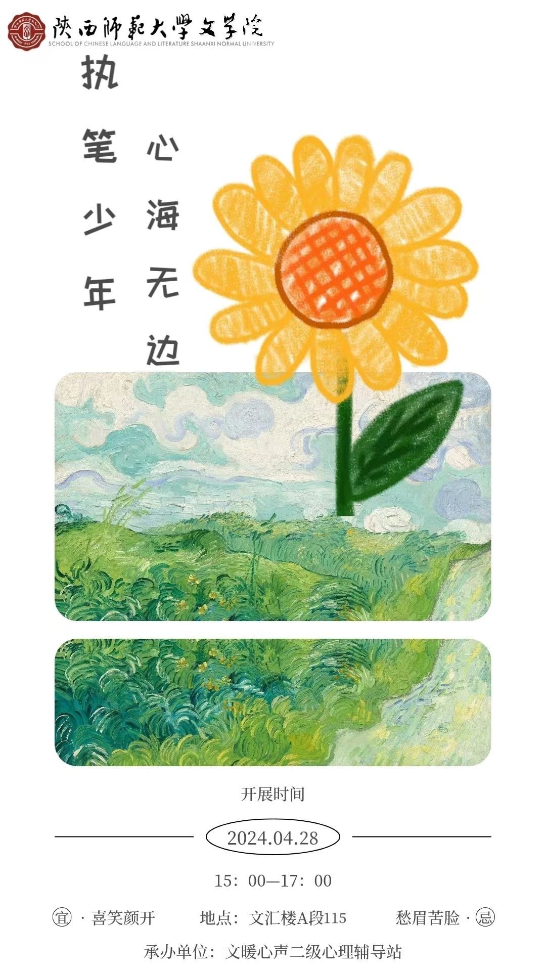 文暖心声“心海无边 执笔少年”特别活动开始啦!4月28日(周日)15:00——17:00,我们于文汇楼A段115欢迎大家的到来!